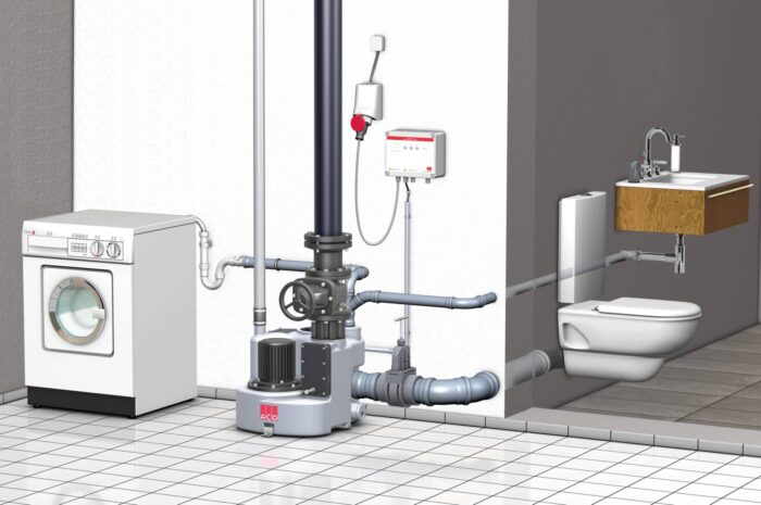 Aus Räumen, die unterhalb der Rückstauebene liegen, fließt das durch Dusche, Waschbecken, Waschmaschine und/oder Toilette anfallende Schmutzwasser nicht vonalleine in die Kanalisation. Es muss mittels Hebeanlage so hoch über die Rückstauebene gepumpt werden, damit ein ausreichend starkes Gefälle für den Abfluss sorgt.© ACO Haustechnik