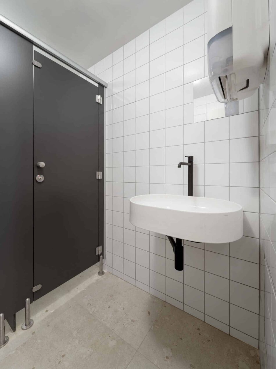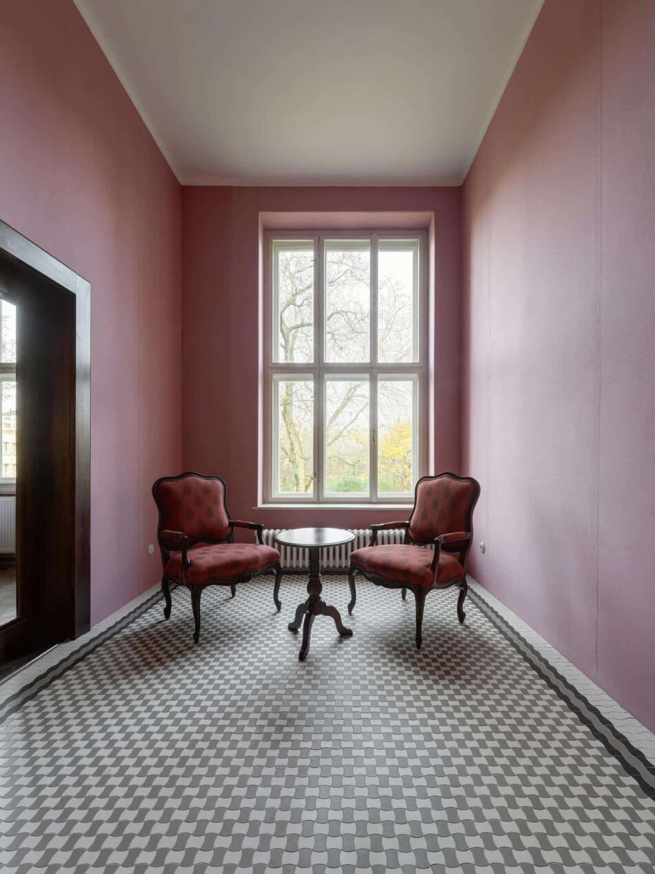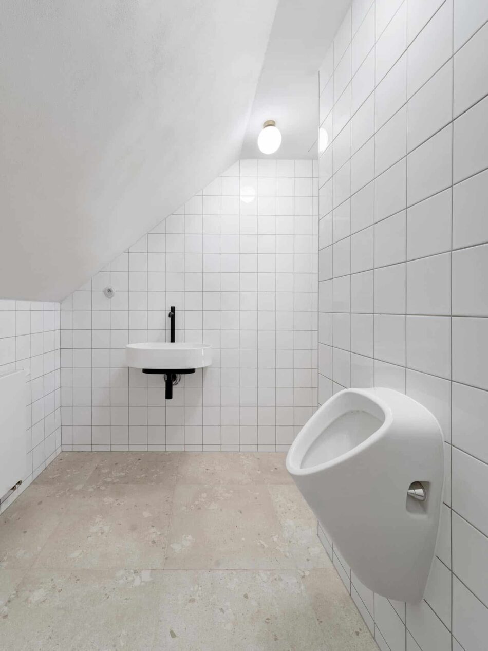 Neben Repliken lieferte RAKO weitere Keramikfliesen für die Villa: Im Innenbereich Bodenfliesen der Serie Castone (60×60 cm) sowie weiße, glänzende Wandfliesen (15×15 cm) in den Sanitäranlagen verlegt. Die natürlichen Materialien wurden so gewählt, dass sie sich in ihrem Design sensibel an den architektonischen Stil anlehnen und heutige funktionale wie hygienische Anspekte erfüllen.