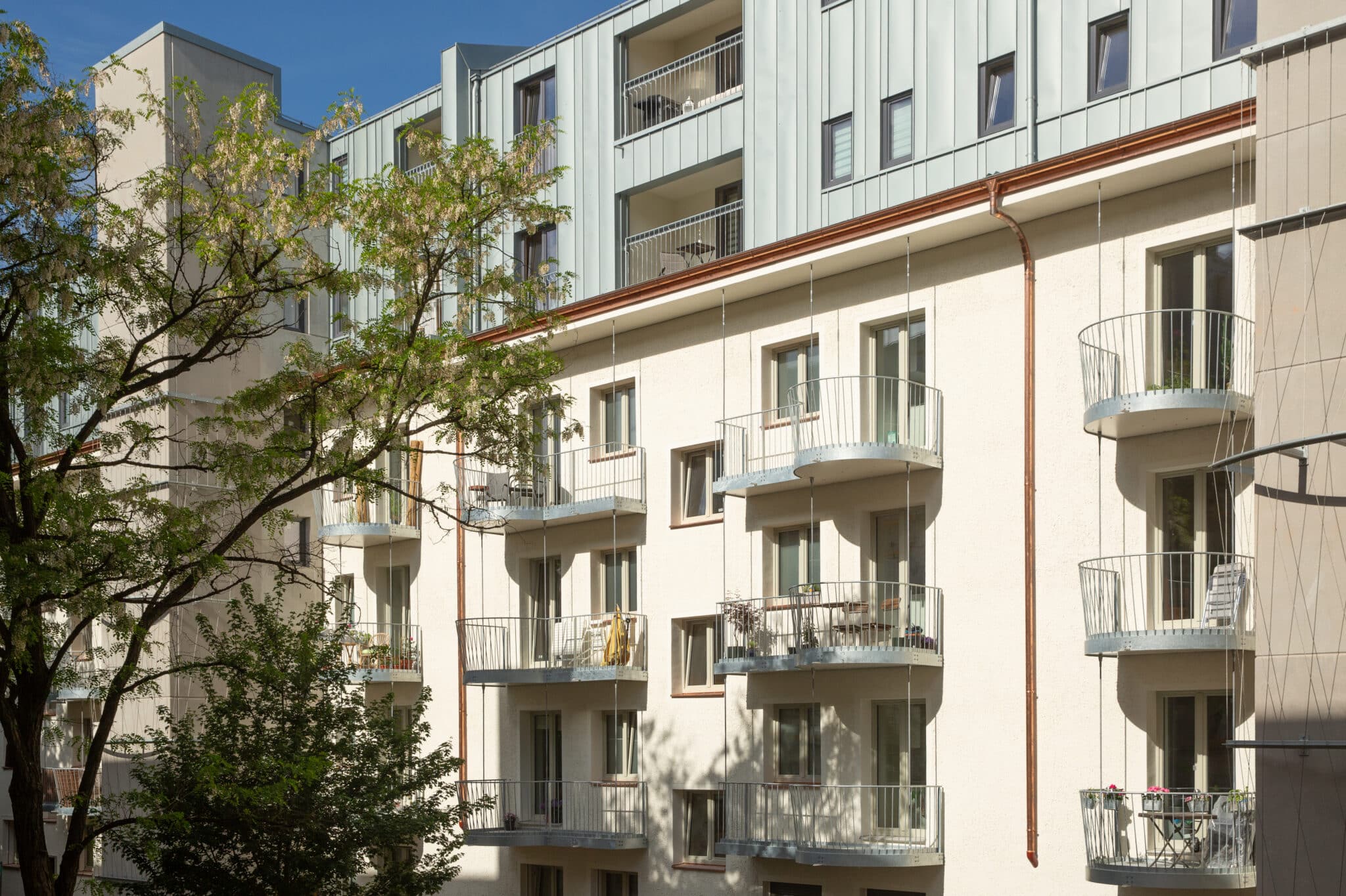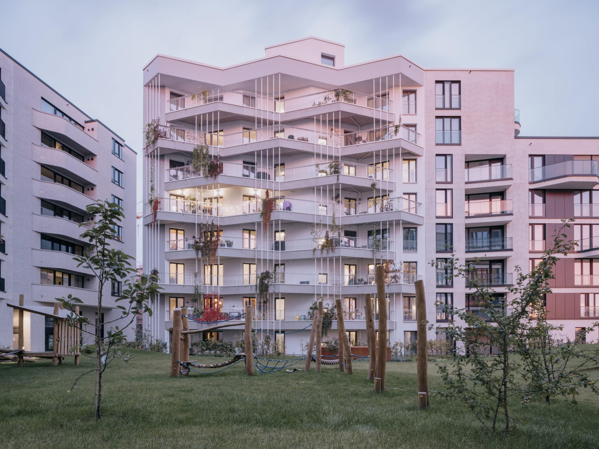 Orte der Begegnung: Die begrünten Balkone der „Heimatmole“ sind mit dem Treppenhaus, aber auch untereinander verbunden. © Florian Holzherr