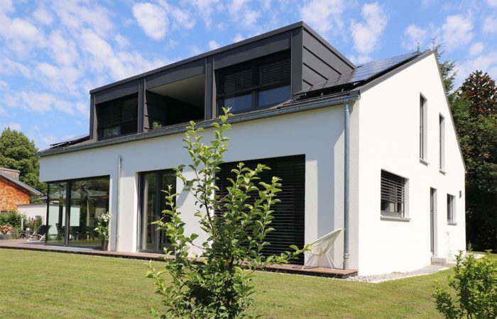 Im Dachgeschoss bietet eine, in den Dachaufbau integrierte, offene Loggia einen weiteren geschützten Freibereich für die Räume im Dachgeschoss. Das Gebäude wird mit einer Luft-Wasser-Wärmepumpe beheizt und ist mit einer PV-Anlage ausgestattet.