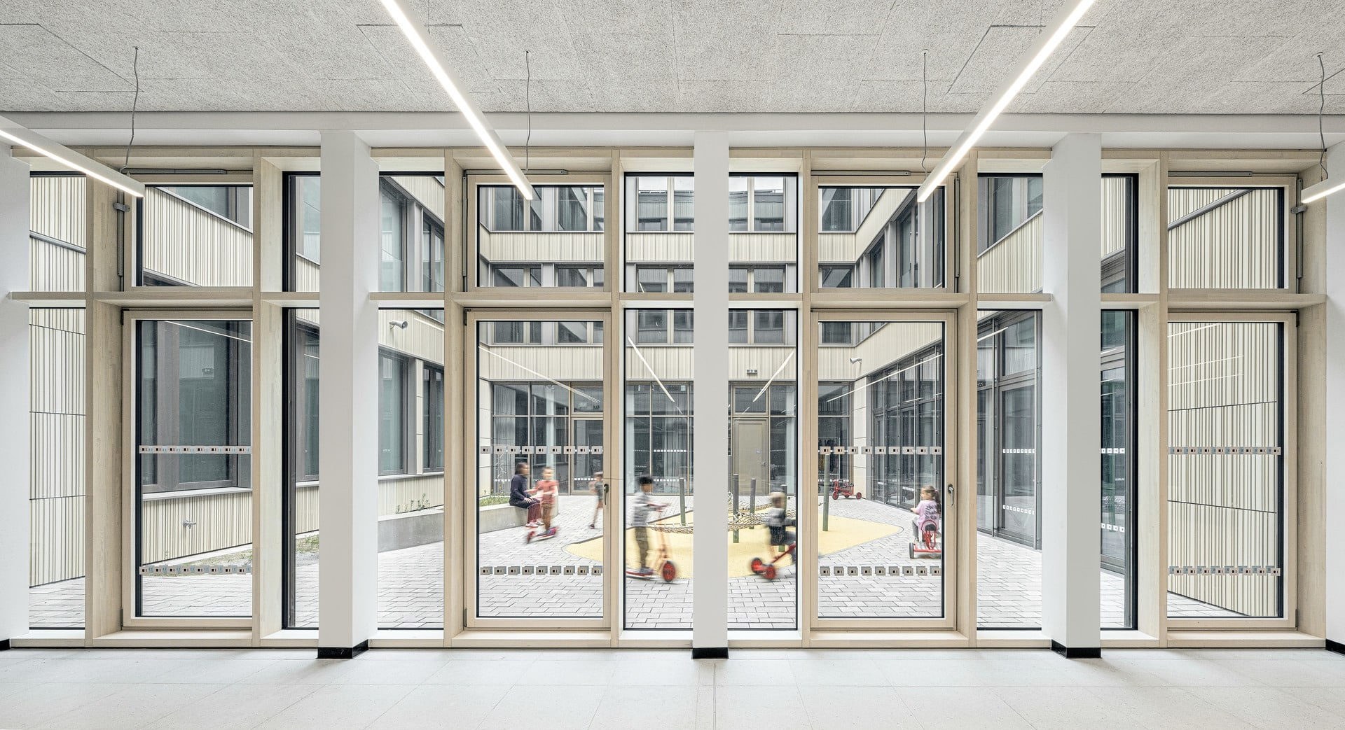 Die architektonische Gestaltung der Maria-Leo-Grundschule setzt auf Transparenz, Helligkeit und Flexibilität. Großzügige Fensterfronten sorgen für viel Tageslicht und schaffen eine angenehme Lernatmosphäre. Die Flure sind weitläufig und mit Sitznischen, Lerninseln und Fenstertischen ausgestattet, die differenziertes Lernen, Begegnung und Kommunikation ermöglichen.