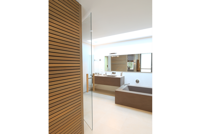 Man merkt kaum, dass man wohnt – so frei bewegt man sich in diesem Haus und so selbstverständlich ist alles Notwendige vorhanden; und neben dem Notwendigen das Besondere und Schöne, zum Beispiel ein exklusives Bad aus Naturstein neben der barrierefreien Sauna, ein großzügiger Ankleideraum und eine individuell gefertigte Wendeltreppe, die Erdgeschoss und Dachboden verbindet.
