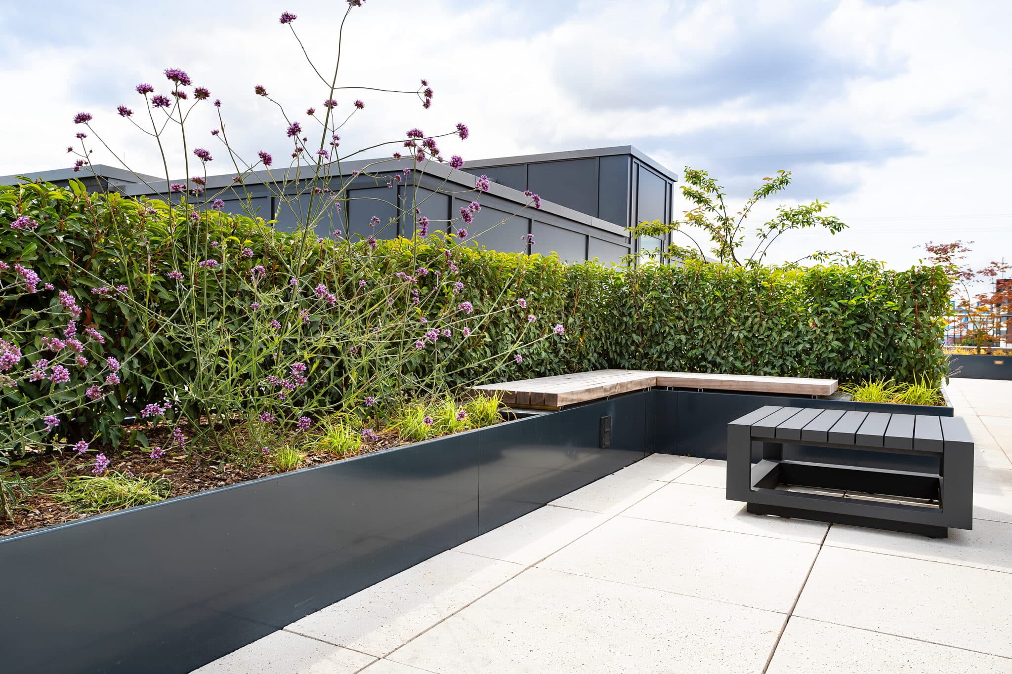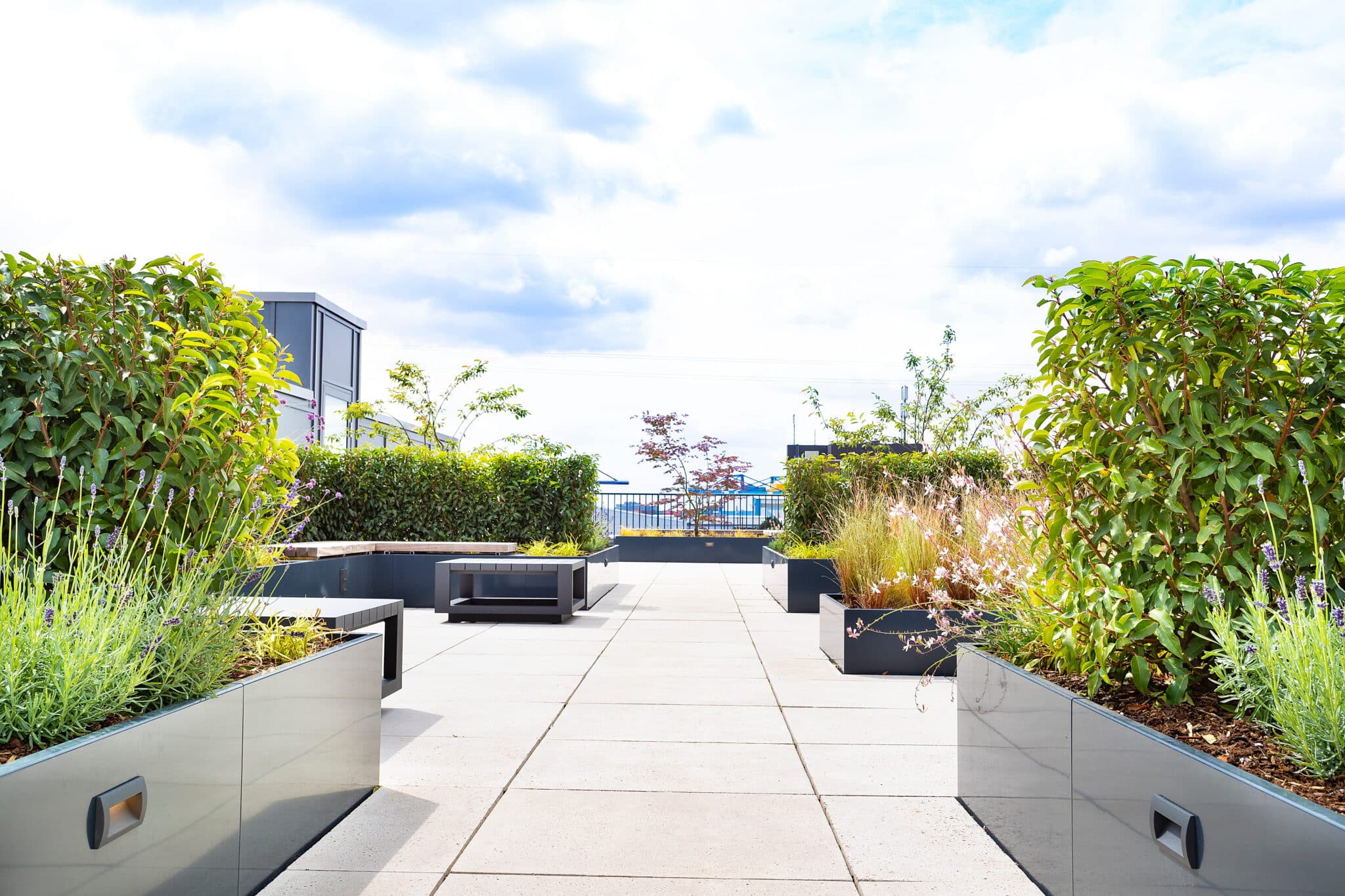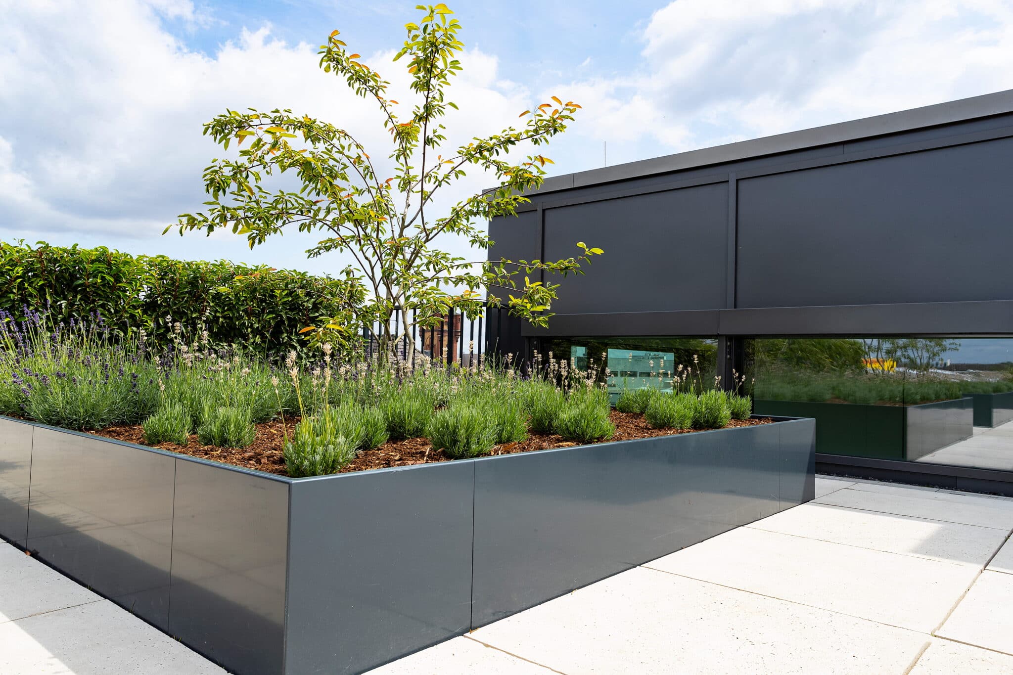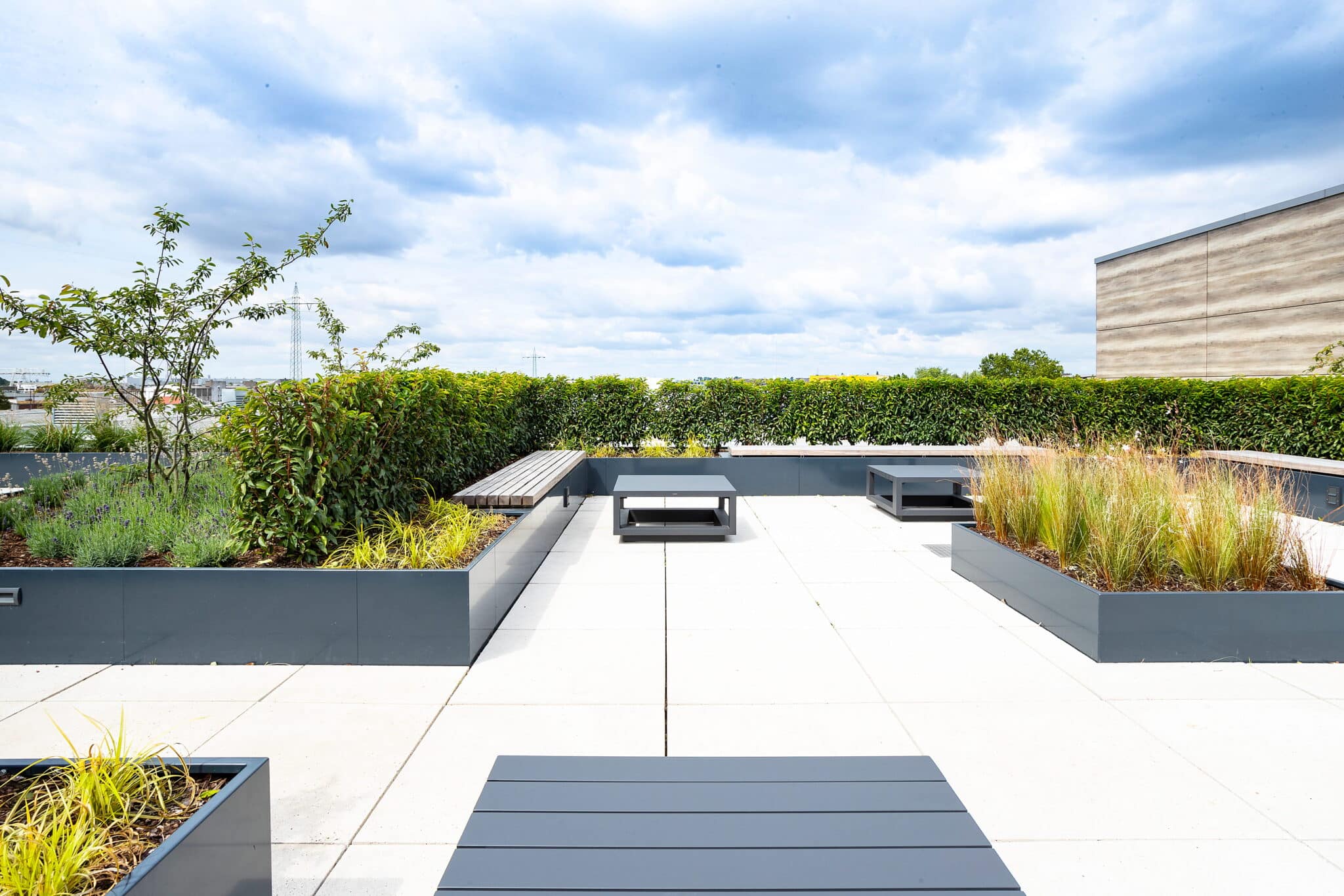 Ein prägendes Element dieses Projekts sind die Optigrün Randelemente aus Aluminium, denn sie übernehmen gleich mehrere Funktionen. Zum einen sorgen sie für eine klare und saubere Abgrenzung zwischen Belagsflächen, Grünbereichen und Aufenthaltszonen. Zum anderen strukturieren sie den Dachaufbau und tragen maßgeblich zu einem aufgeräumten, modernen Erscheinungsbild bei. Gerade auf intensiv genutzten Dachflächen überzeugen die Randelemente durch ihre hohe Witterungsbeständigkeit, Stabilität und Langlebigkeit.