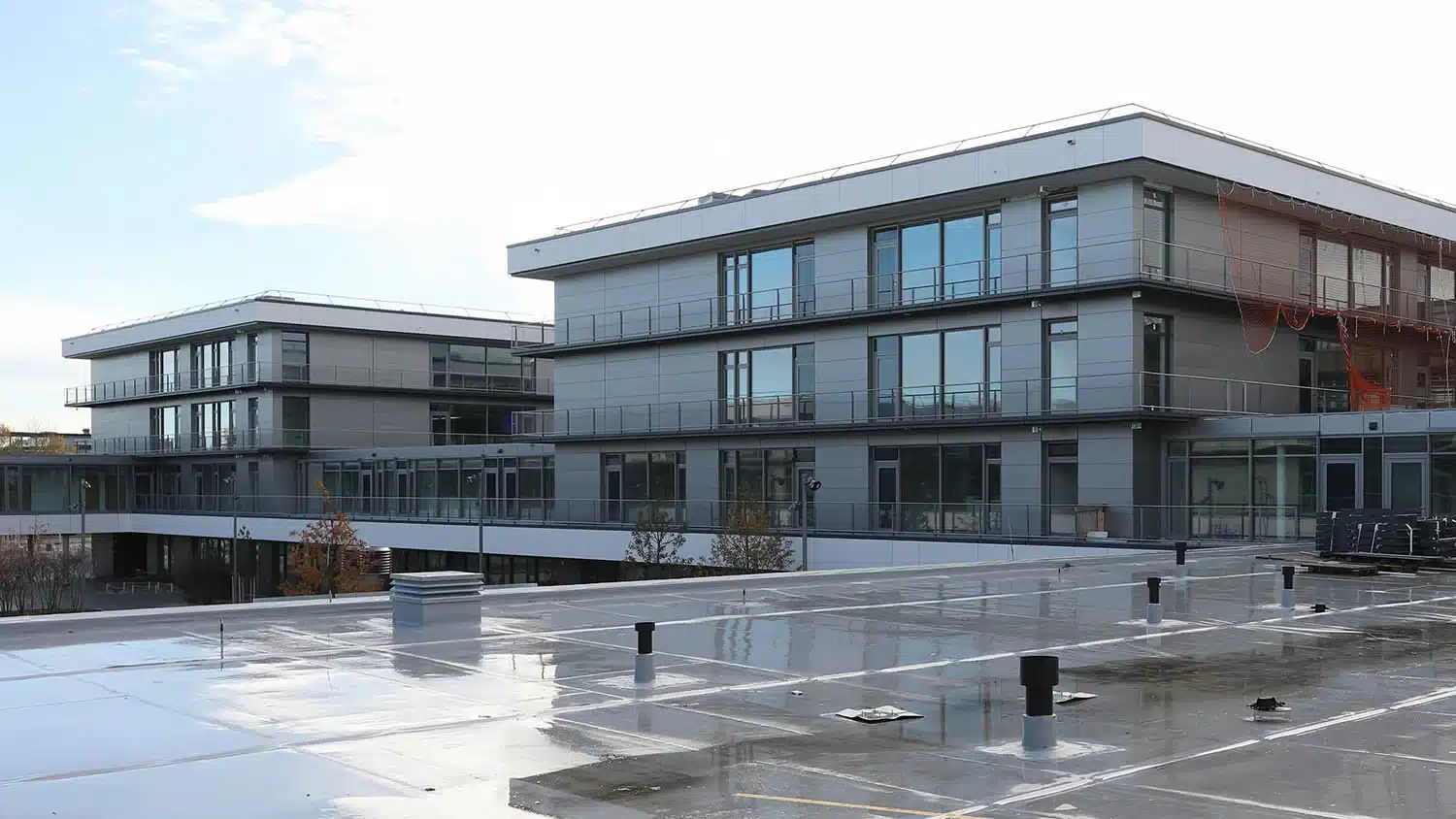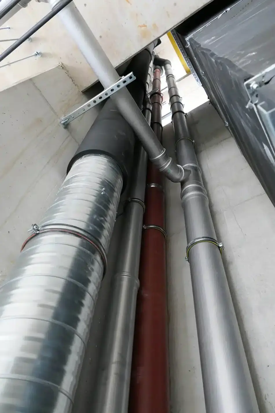 Um auch in kalten Witterungsperioden eine sichere Wasserableitung zu gewährleisten, wurden die Rohrleitungen mit einer Begleitheizung ausgestattet. Diese verhindert das Einfrieren des Wassers in den Fallleitungen und sorgt für einen störungsfreien Betrieb.