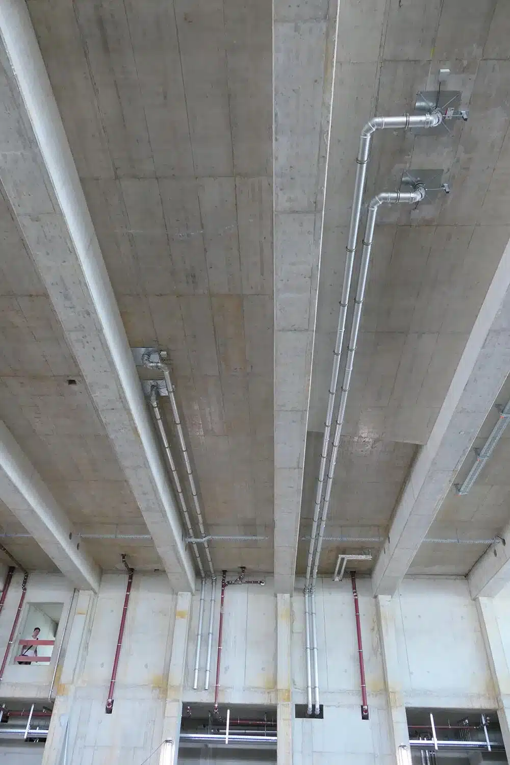 Das Rohrsystem der Dachentwässerung, unter anderem sichtbar im Bereich der Sporthalle des Bildungscampus Riem, wurde aus hochwertigem Edelstahl V4A gefertigt. ACO Pipe Edelstahlrohre in den Dimensionen DN 100 bis DN 315 gewährleisten eine langlebige und widerstandsfähige Entwässerungslösung.
