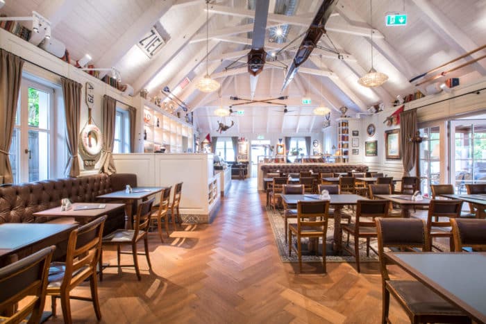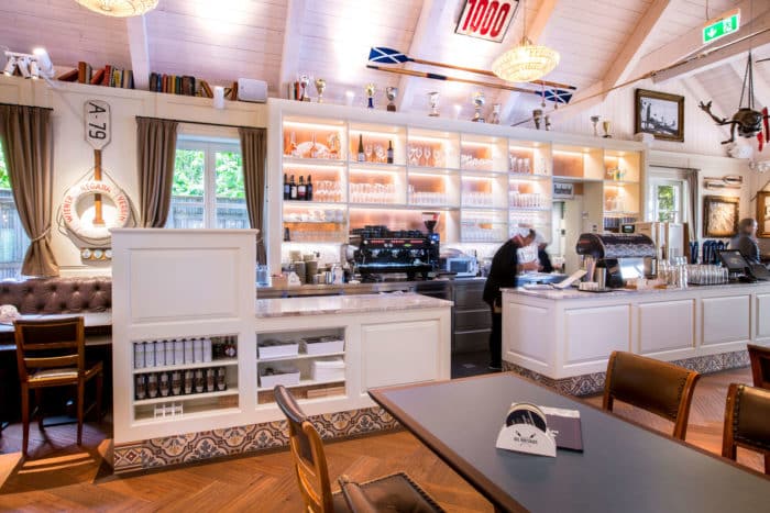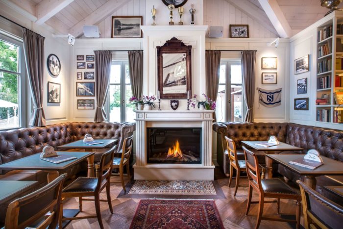 Zeitaufwendig zusammengesuchte und ersteigerte Originale, wie klassizistische Altbaufliesen und liebevoll restaurierte Stühle werden mit dunklem Fischgrätboden und Chesterfield-Lederbänken kombiniert. Eingefasst wird das Ganze von Holzvertäfelungen, alten Spinden sowie Sprossenwänden und Sportgeräten für das authentische “Gym-Feeling”. Das Finish für die perfekte Ruderclub-Romantik bildet ein offener Dachstuhl in gedecktem Weiß, an dem Kristall-Luster aus England sowie ein Ruderboot abgehängt wurden. Der Kamin im Zentrum des Bootshauses ist ein weiteres Highlight.
