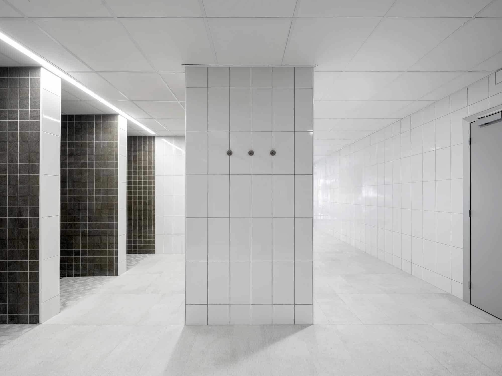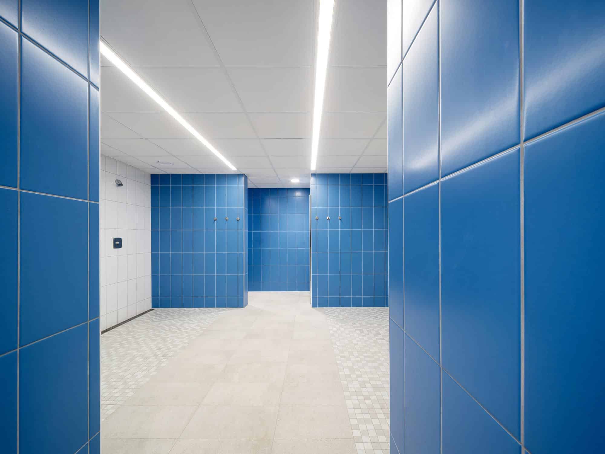 Bei der Materialauswahl lag der Fokus auf technologischer Innovation in Verbindung mit moderner Architektur und hoher Sicherheit. Das Architektenteam entschied sich für Keramikfliesen der tschechischen Marke RAKO aufgrund ihrer Qualität und großen Gestaltungsvielfalt. In der Schwimmhalle kamen die Serien Pool und Color Two in dezenten, modernen Farbtönen zum Einsatz, während die Stützpfeiler mit Fliesen in eleganter Betonoptik aus der Serie Cemento akzentuiert wurden.