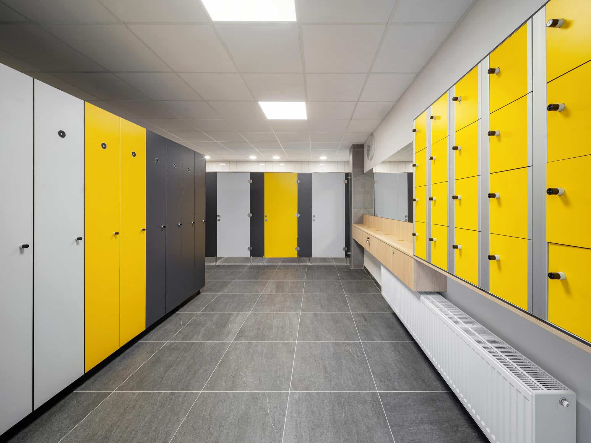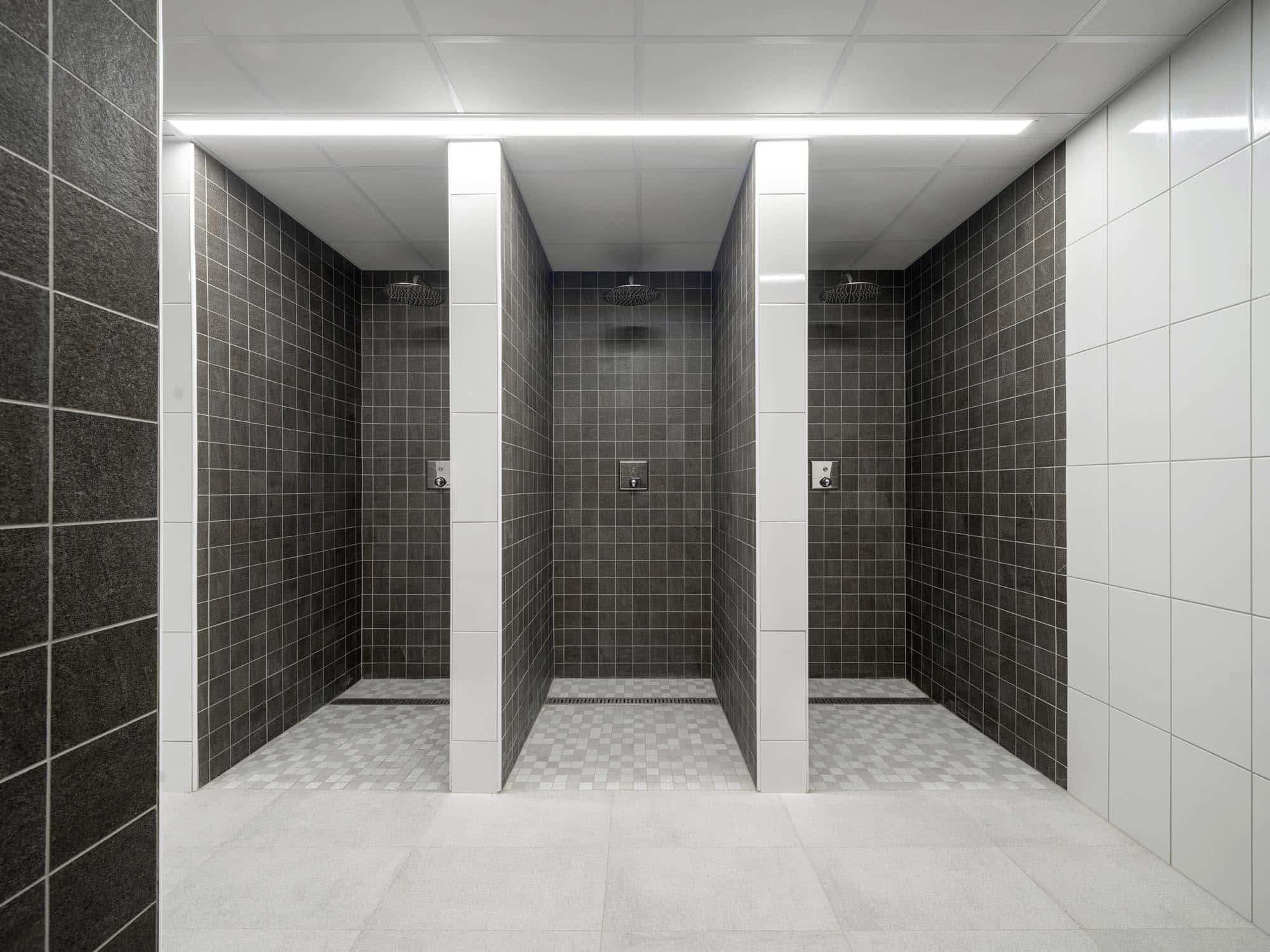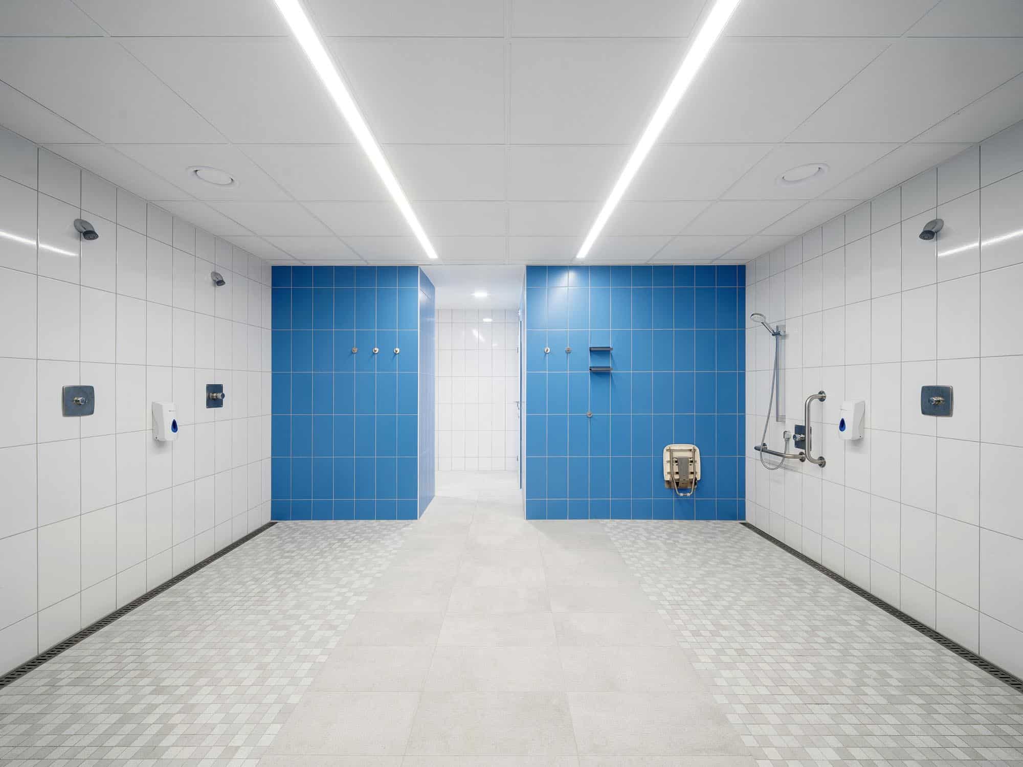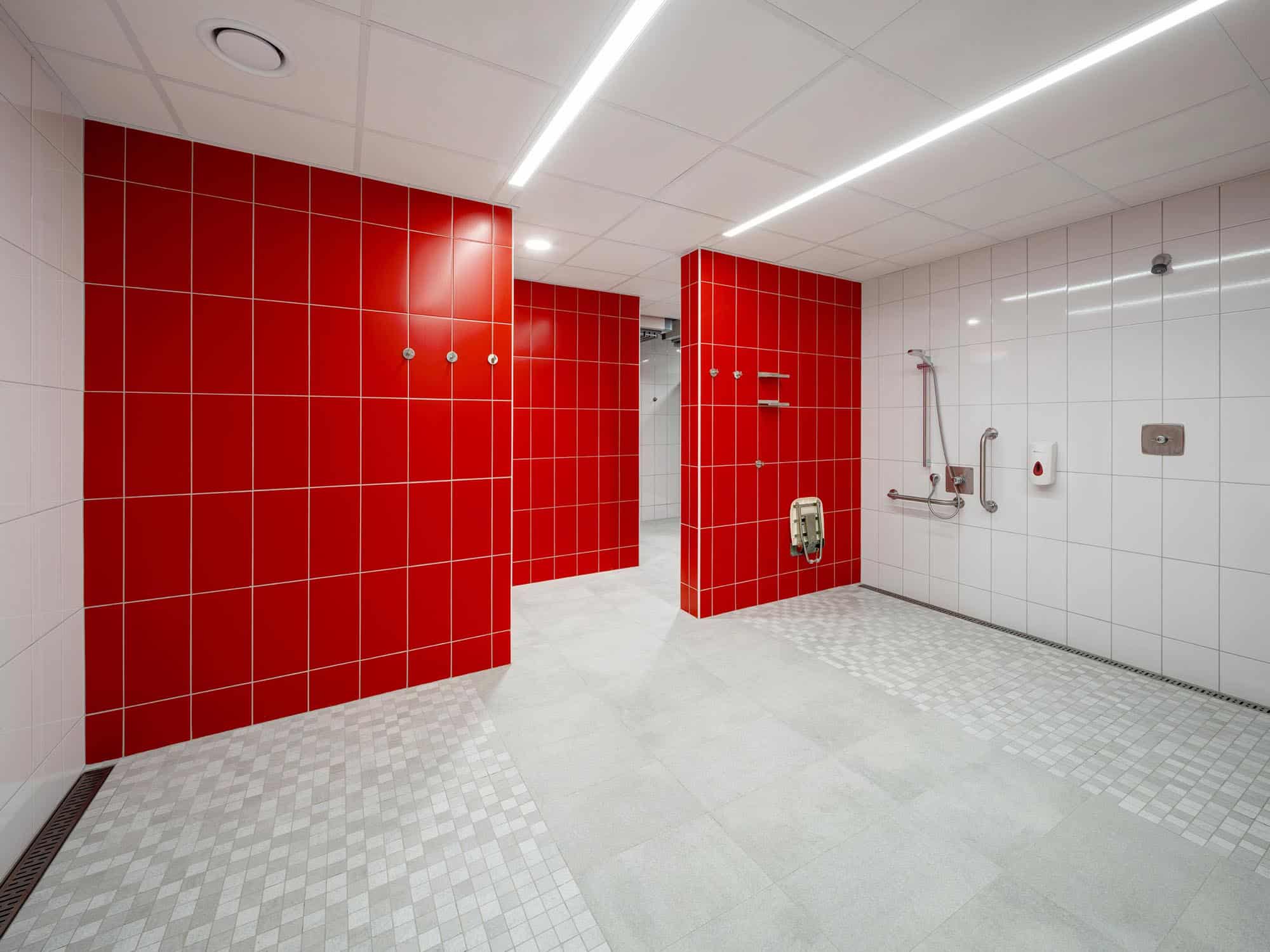 Architekt Kadečka legt Wert auf den Komfort der Badegäste und eine verbesserte Orientierung. Aktuellen Trends folgend, wurden gemeinsame Umkleiden anstelle getrennter Bereiche eingerichtet. Die Farbcodierung in den Duschen (Blau für Herren, Rot für Damen, Serie Color One) unterstützt die einfache Orientierung. Im Eingangsbereich dominieren erdige Farbtöne mit Fliesen aus der Serie Quarzit.