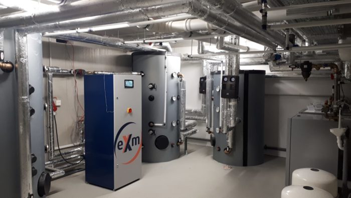Die eXergiemaschine ist ebenfalls eine Wärmepumpe, aber eine spezielle. Sie wurde von den Partnern varmeco und BMS-Energietechnik konzipiert, um zum Beispiel Solarthermieanlagen oder Abwärme besser für Heizzwecke nutzbar zu machen und die Temperaturschichtung im Wärmespeicher zu optimieren. Im Gegensatz zu typischen Heizungswärmepumpen arbeitet die eXergiemaschine in einem höheren Temperaturbereich und kann große Temperaturhübe in einem Umlauf realisieren. Für das Haus in der Anna-Kloos-Straße mit seinen zwölf Wohneinheiten die ideale Lösung, denn dort dient die eXergiemaschine als „Wärme-Booster“. Sie entnimmt dem Niedertemperaturspeicher, der von der Luft-Wärmepumpe geladen wird und die Heizkreise bedient, thermische Energie, hebt die Temperatur um rund 20 K an und speist die Wärme bei 60 °C in einen Hochtemperaturspeicher. „So erreichen wir energieeffizient ein Temperaturniveau, das hoch genug ist für eine hygienische Warmwasserbereitung“, so Rode.