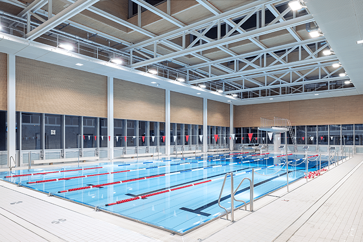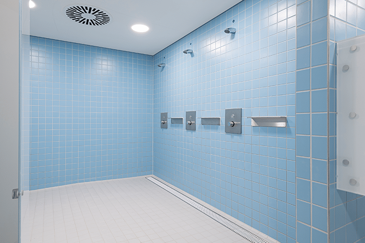 Die Entwässerungstechnologie in diesem Hightech-Gebäude stammt hauptsächlich von ACO Haustechnik. Dies umfasst die Dachentwässerung und individuell gefertigte Entwässerungsrinnen, einschließlich Bodenabläufen und Rollrosten für die Schwimmbecken und Duschbereiche. An das Produkt Entwässerungsrinne bestand in erster Linie die Anforderung, der Beanspruchung durch Chlor standzuhalten. Darüber hinaus ist es wichtig, dass sie das Schleppwasser sicher im Laufbereich aufnehmen und damit zur Unfallvorbeugung beitragen können. Dank seiner Material- und Verarbeitungsqualität (Montage/Verschweißung) fiel die Produktentscheidung zugunsten der ACO Kastenrinnen HF-S aus korrosionsbeständigem Edelstahl 1.4571 in der Qualität V4A mit NKH-Profil (ein 50 mm breiter besandeter Flansch, optimal für den Anschluss der Abdichtung im Verbund unterhalb Fliesen).
