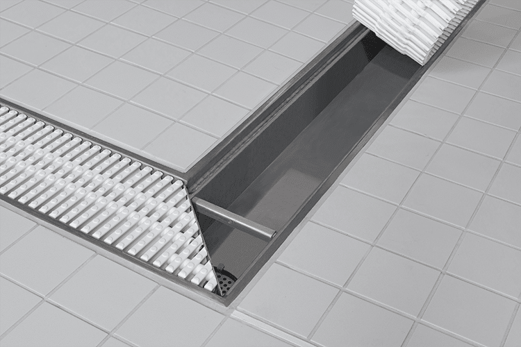 - ACO Hygiene-Kastenrinnen HF-S (für die Beckenumrandungen und Duschen) aus Werkstoff Edelstahl 1.4571 mit NKH Profil