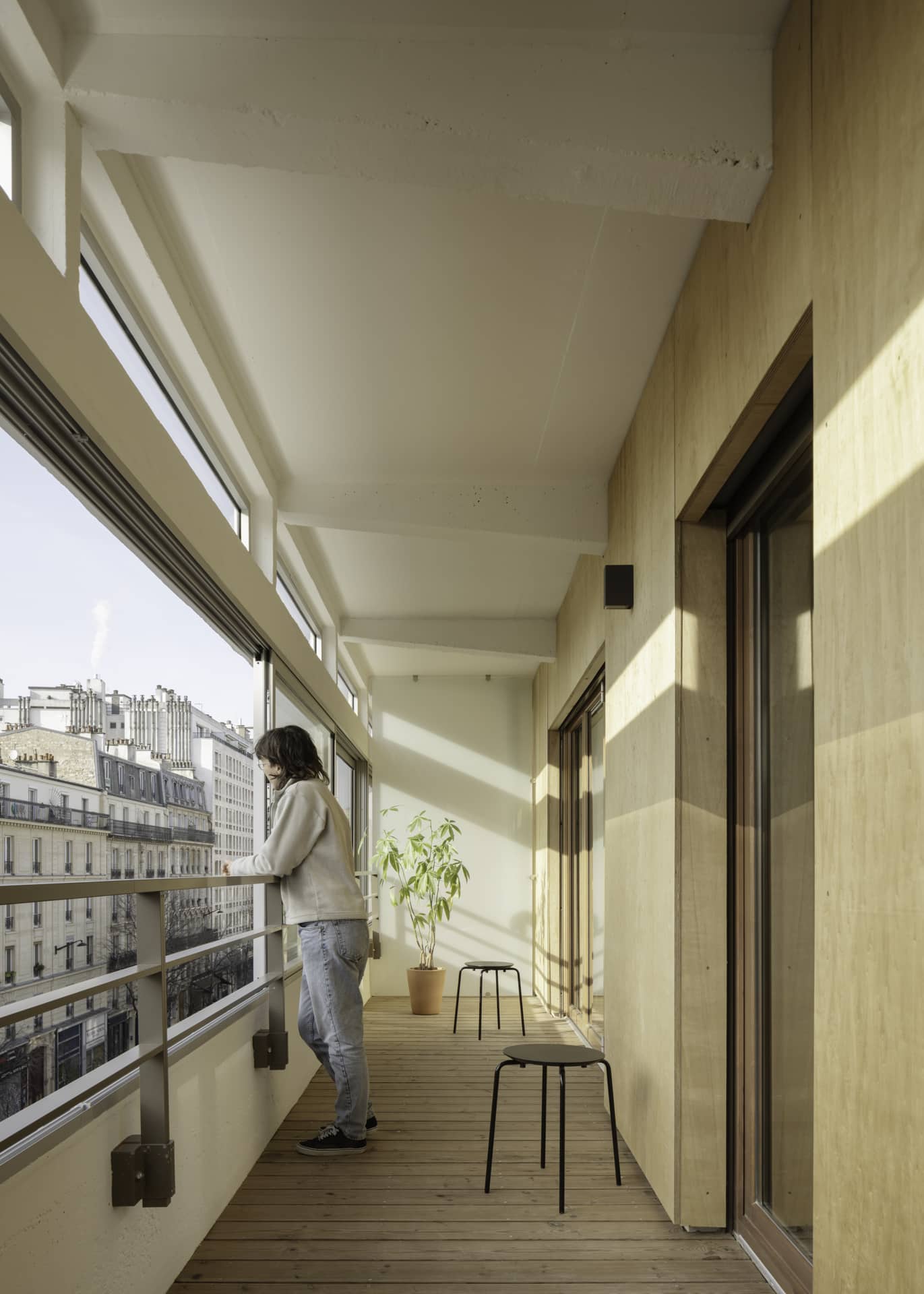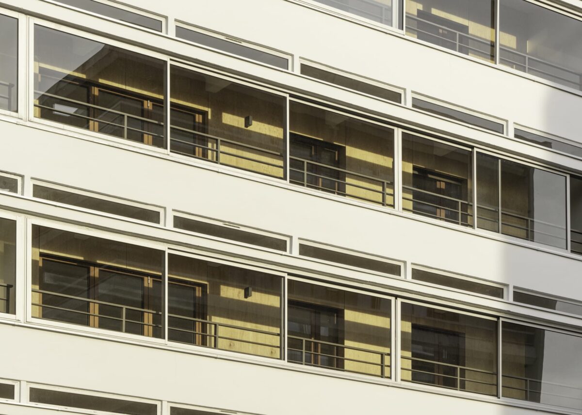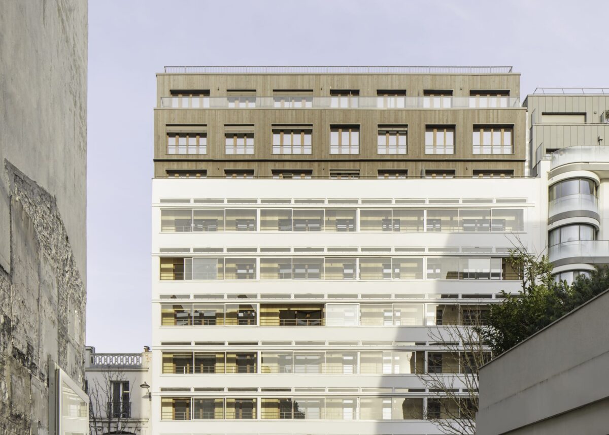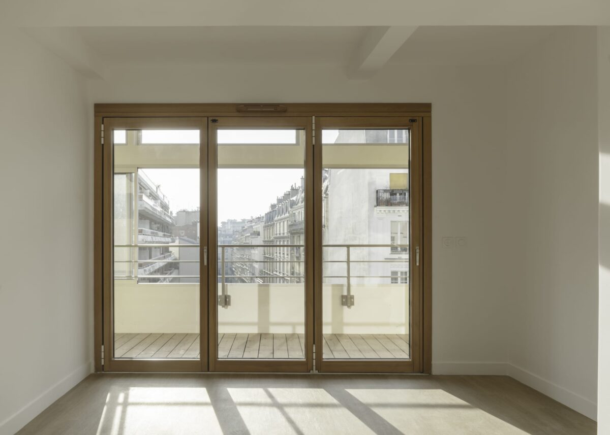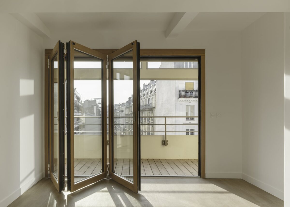 Als Übergang in die Wintergärten wurden 18 Glas-Faltwände des Systems Woodline von Solarlux verbaut. Jedes Element besteht aus drei Segmenten, die sich nach innen öffnen und – je nach Einbausituation – entweder nach links oder rechts zu einem schmalen Paket zusammenfalten lassen. „Die Glas-Faltwände unterstützen unser architektonisches Konzept von Offenheit und Durchlässigkeit“, erklärt Projektarchitektin Claire de Fraguier. Zum Thema Schallschutz fügt sie hinzu: „Dank der optimalen Schall- und Wärmedämmung der Woodline-Faltwände konnten wir darüber hinaus den geforderten Lärmschutz in den Wohnungen sicherstellen – ein entscheidender Aspekt bei der Lage an der vielbefahrenen Avenue Parmentier.“ Die Woodline-Serie zählt zu den wenigen Glas-Faltwandsystemen aus Holz auf dem Markt und wurde – passend zum Fußbodenbelag der Wintergärten – aus Kiefer gefertigt. Die schlanken Rahmenprofile lassen auch im geschlossenen Zustand viel Tageslicht in die Wohnungen, während die hohe Funktionalität und der Komfort den Anforderungen an modernes Wohnen gerecht werden.