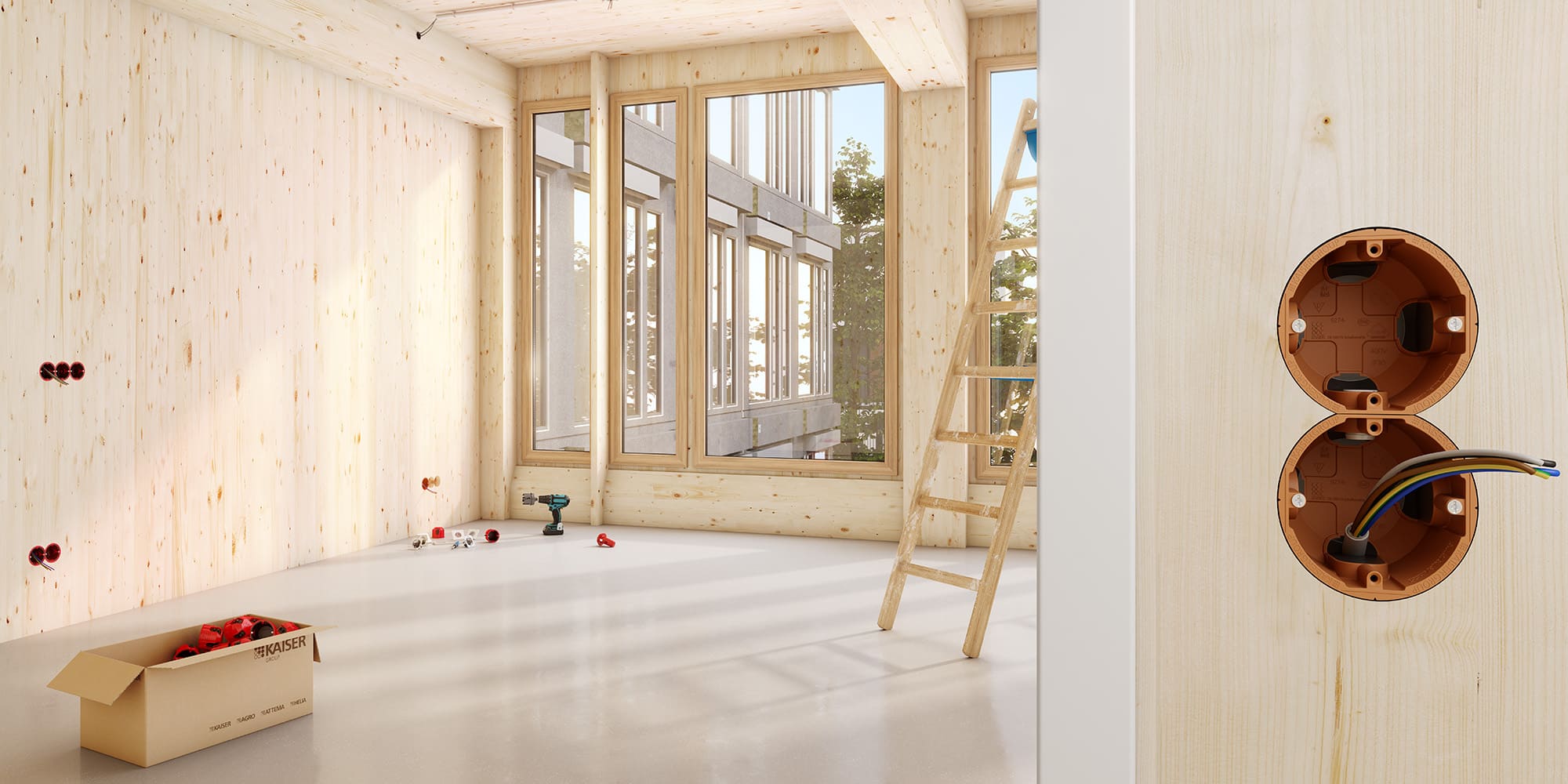 Mit den innovativen Geräte-Verbindungsdosen Massivholz und Brandschutz Massivholz PROTECT® hat KAISER einen neuen Standard geschaffen, der erstmals die Klemmrippen-Befestigung in der Bauteilöffnung festlegt.