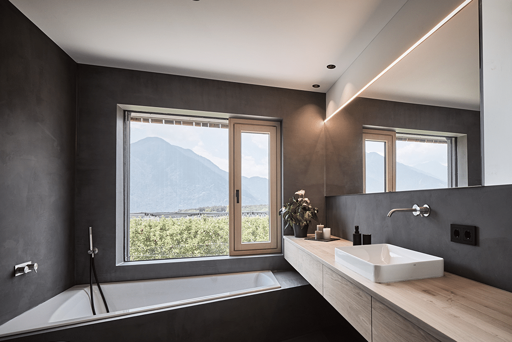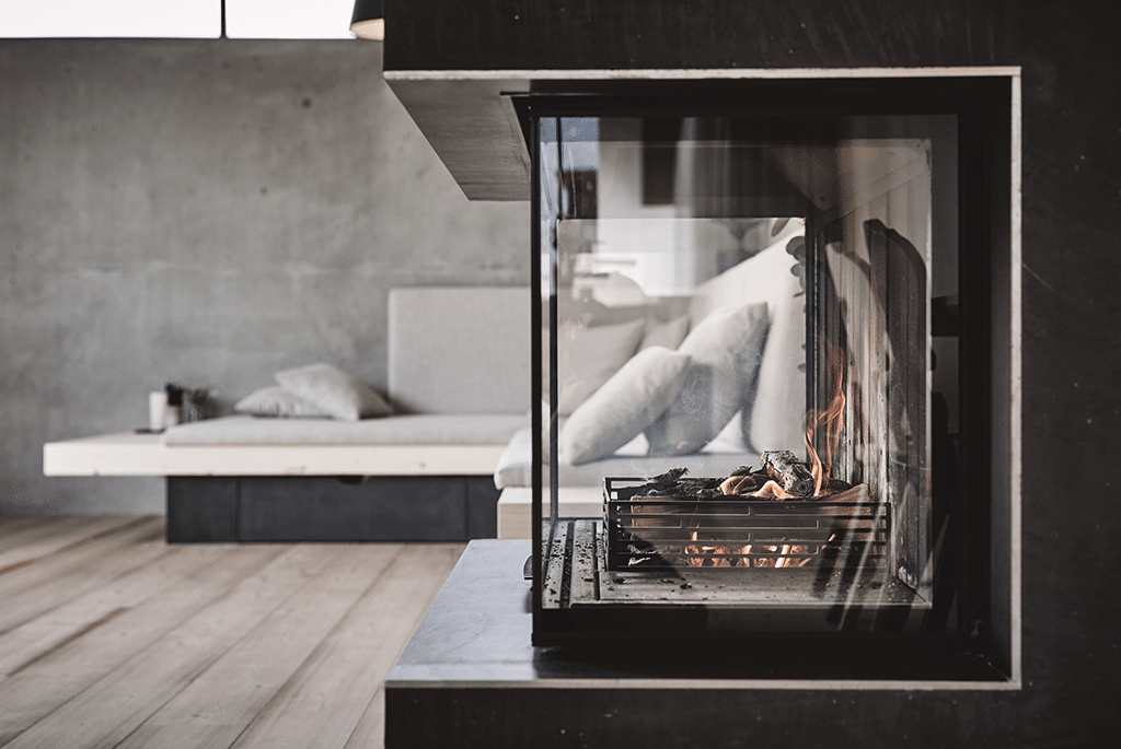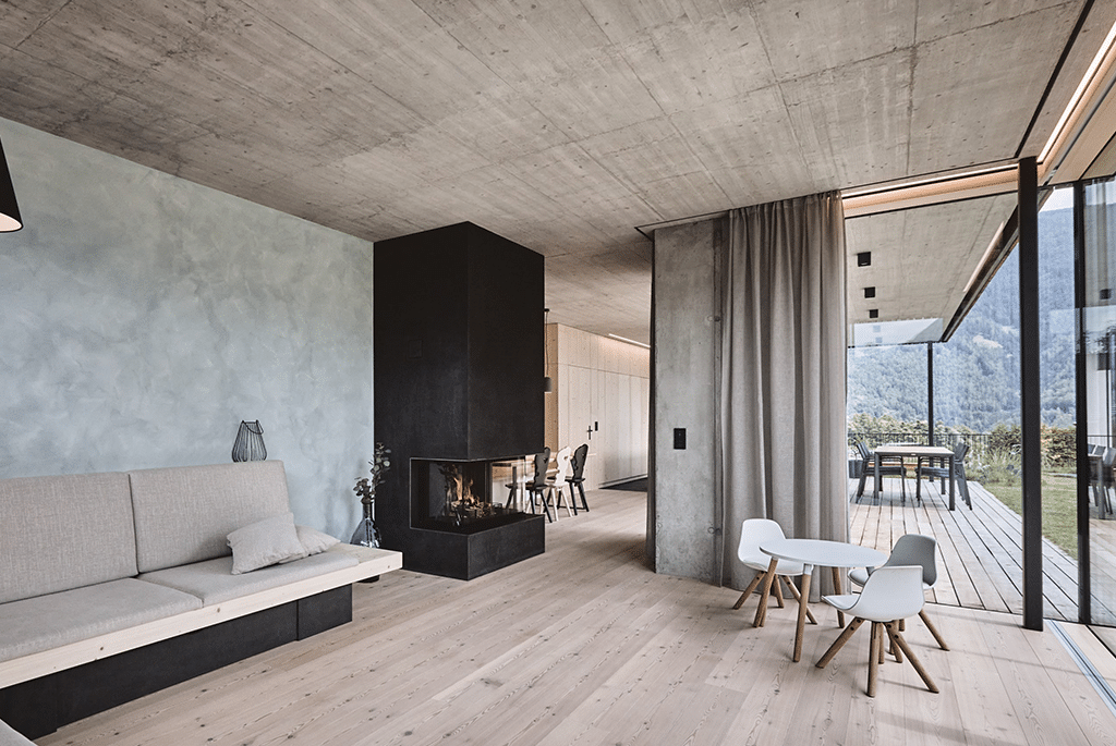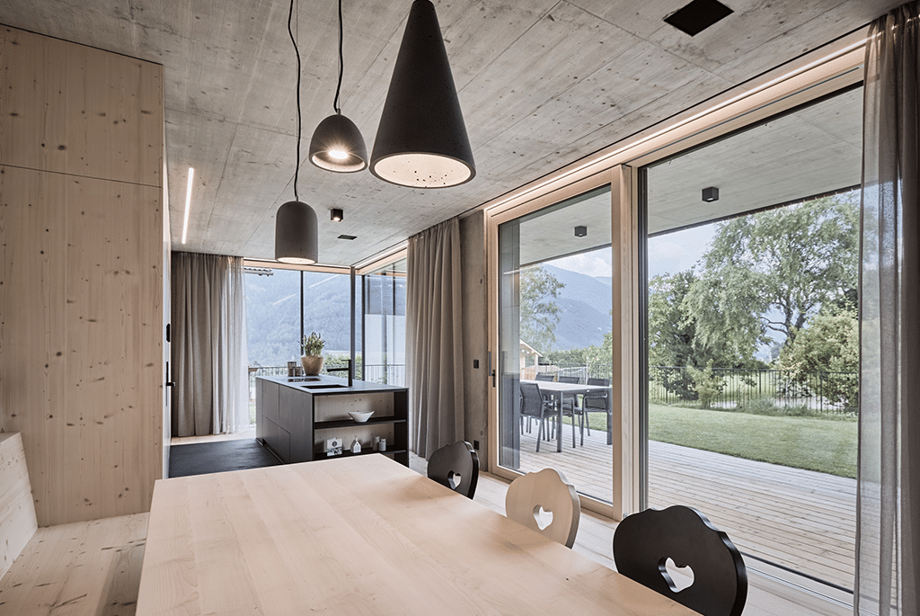 Das in Sichtbetonweise ausgeführte Erdgeschoss kombiniert mit dem Massivholzbau im Obergeschoss vermitteln Wohnbehagen und Gemütlichkeit. Durch die großen Öffnungen mit Blick in die umliegende Natur wird das Gefühl, Teil dieser zu sein, gestärkt.