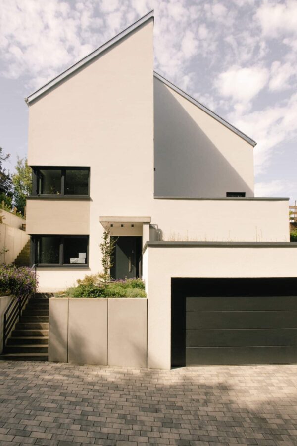 Ein besonderes Grundstück mit seinem Höhenunterschied prägte die architektonische Idee für dieses Einfamilienhaus. Während sich im unteren Bereich ein praktischer Zugang mit Garage befindet, öffnet sich das Gebäude nach oben hin mit einer geschützten Terrasse mit weitem Blick ins Grüne.