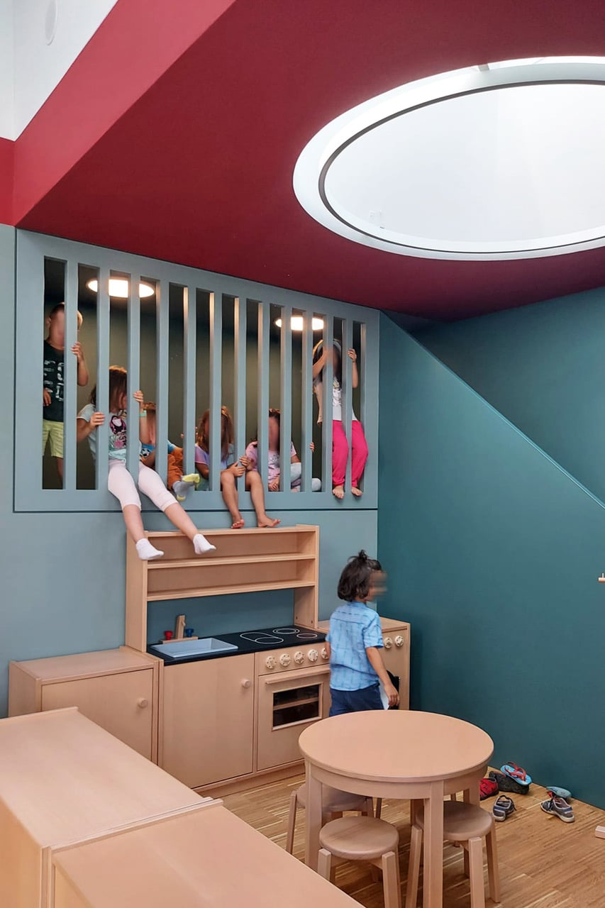 „Das Projekt entstand aus unterschiedlichen Überlegungen und architekturhistorischen Einflüssen, in denen wir räumliche Qualitäten entdeckten – was für die Kinder keine Rolle spielt. Entscheidend ist, dass ein stimmiges Gebäude geschaffen wurde: eine neue, zeitgemäße Raumgestalt, die die Ansprüche moderner Pädagogik erfüllt und in der sich Kinder und Betreuer:innen wohlfühlen.“ Lukas Imhof