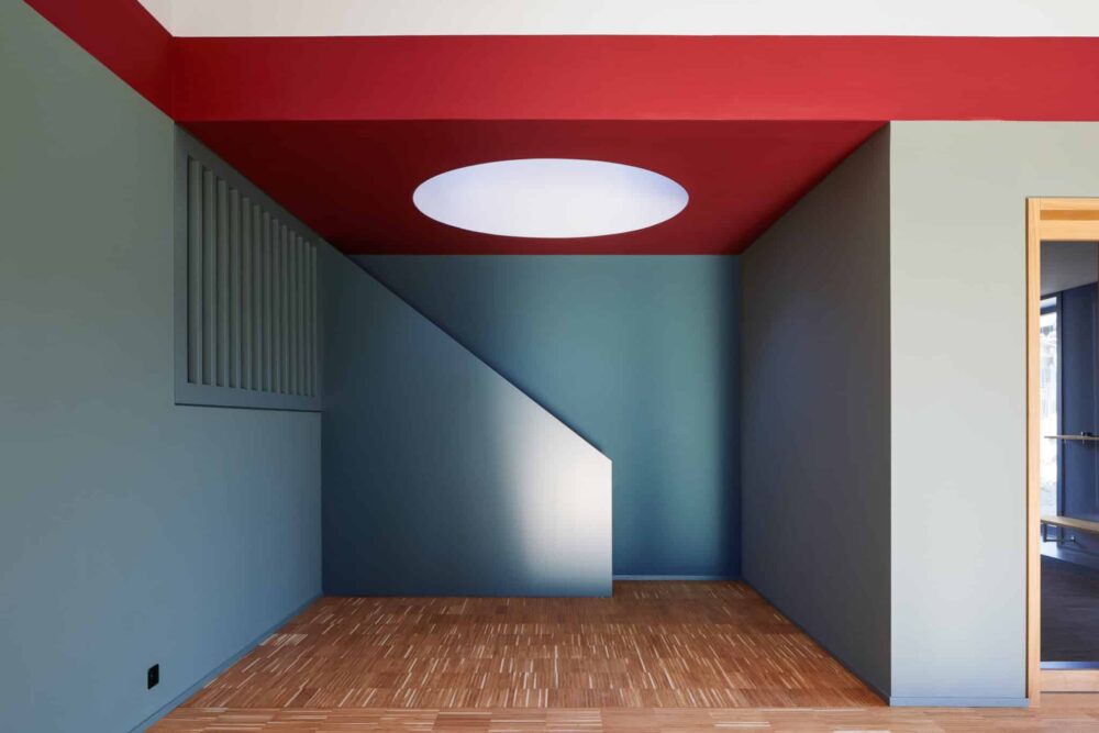 Eine gestalterische Raffinesse zeigt sich in einem Detail, das leicht übersehen werden könnte: Zwischen den Lichtöffnungen bleibt die Decke vollkommen ruhig und eben – weder Leuchten noch Lüftungselemente stören die klare Geometrie. Ursprünglich hatte Lukas Imhof runde Oberlichter vorgesehen. Schließlich entschied er sich für die bewährte, quadratische Variante von VELUX – ohne jedoch seinen Wunsch nach Kreisformen aufzugeben. Eine eigens entwickelte Übergangsform vermittelt elegant zwischen der quadratischen Fensterbasis und der runden Öffnung im Innenraum.