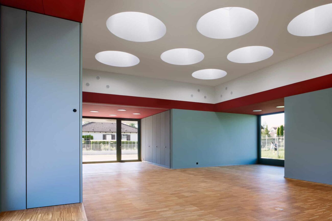 Das Licht von oben prägt die Atmosphäre des Hauptraums im Kindergarten maßgeblich. Für Lukas Imhof Architektur ist es nicht das erste Projekt mit VELUX Produkten – wohl aber das erste, in dem diese eine tragende Rolle im Entwurf übernehmen und zu einem zentralen Gestaltungselement werden.