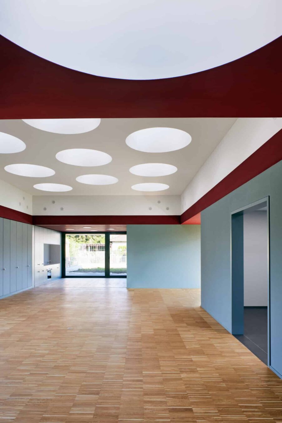 Elf runde Oberlichter gliedern den zentralen Raum rhythmisch, ergänzt durch drei quadratische Öffnungen in den Nebenräumen. Ihre Anzahl und Anordnung folgen dabei keiner technischen Notwendigkeit, sondern einer konsequent ästhetischen Entscheidung – mit überzeugendem Ergebnis: Die Lichtwirkung im Raum spricht für sich.
