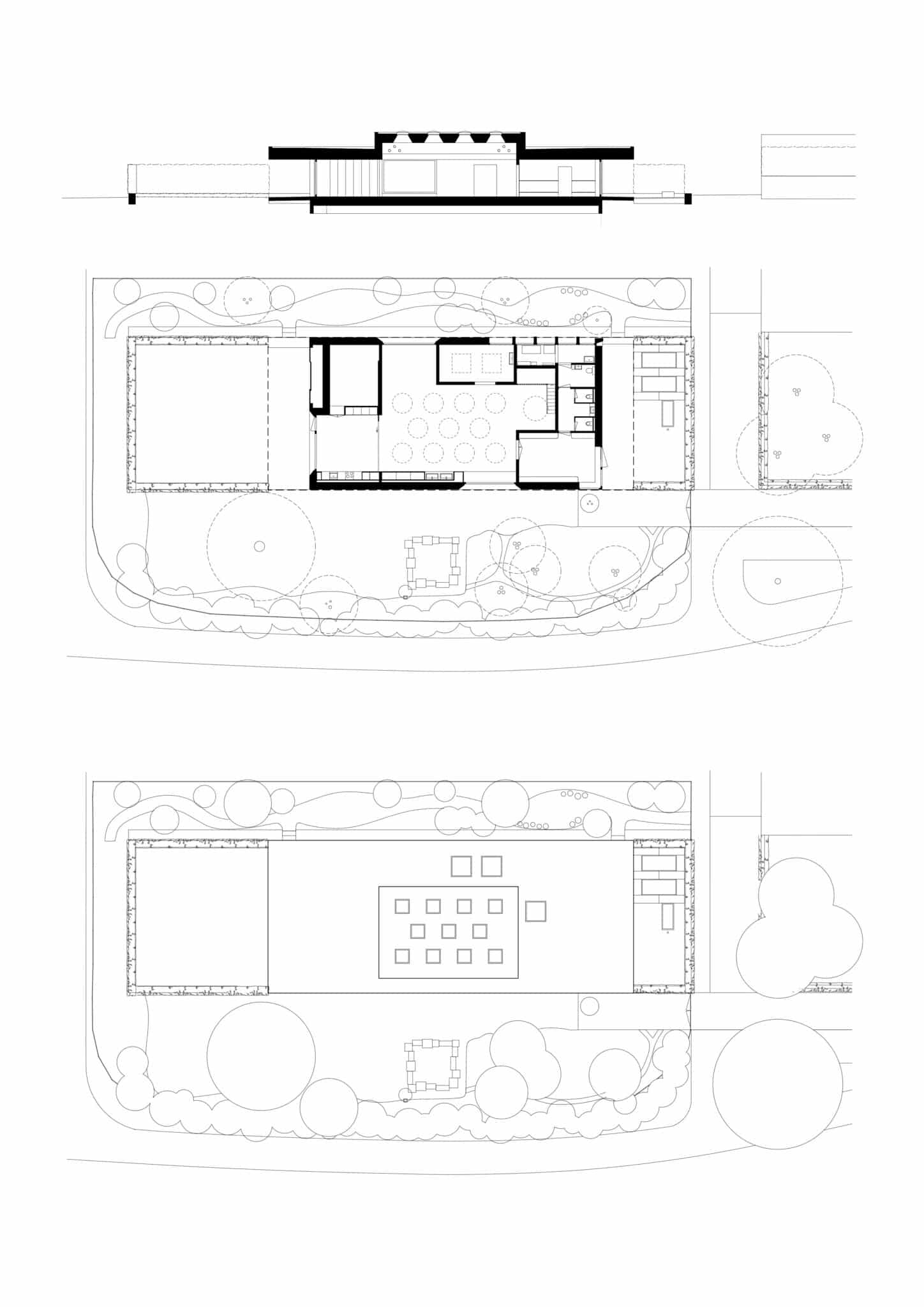 Der Neubau greift gezielt Elemente des ursprünglichen Ensembles auf: Das ikonische, freitragende Betondach mit „Kindergarten“-Beschriftung und die dunkle, robuste Optik spiegeln die vorhandene Ästhetik wider. Am südlichen Fußballfeldrand, neben einem Pfad an den Gleisen gelegen, schließt ein kleiner, eingefriedeter Gartenbereich mit Spielmöglichkeiten und Wiese – die mit der Zeit immer dichter bewächst – nahtlos über Terrasse und bodentiefe Verglasung an den Innenraum an.