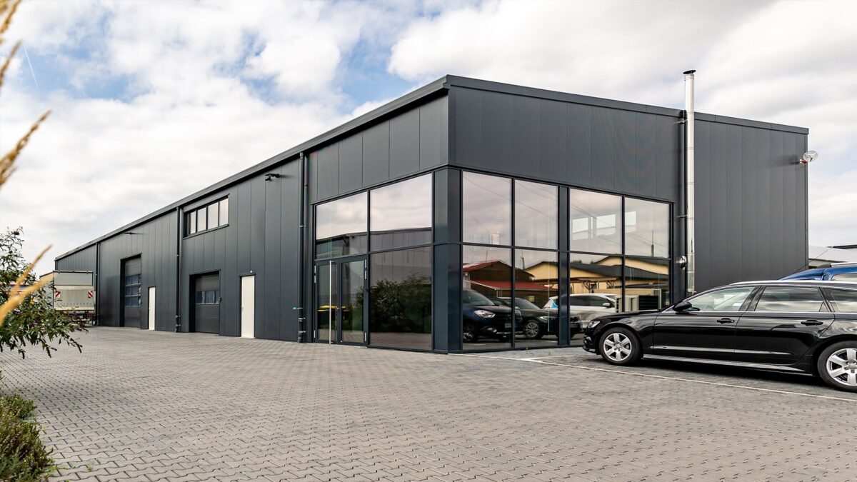 Im vorderen Gebäudeteil schaffen helle Büros und ein klar gestalteter Eingangsbereich eine repräsentative Adresse. Großzügige Fensterflächen fördern Transparenz und Aufenthaltsqualität. Auch die Außenwirkung überzeugt: Mikrolinierte Sandwichpaneele verleihen der Halle eine hochwertige, zeitgemäße Anmutung.