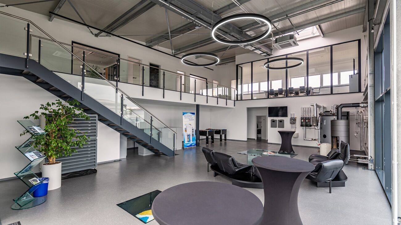 Direkt gegenüber entstand auf 830 m² eine moderne Systemhalle für die Mederer GmbH, die dem innovativen Wärmepumpensystem des Bauherrn eine angemessene architektonische Bühne bietet. Der großzügig dimensionierte, lichtdurchflutete Eingangsbereich der 18 Meter breiten und über 46 Meter langen Halle empfängt Besucher mit einer klaren, offenen Raumwirkung und unterstreicht den repräsentativen Charakter des Gebäudes.
