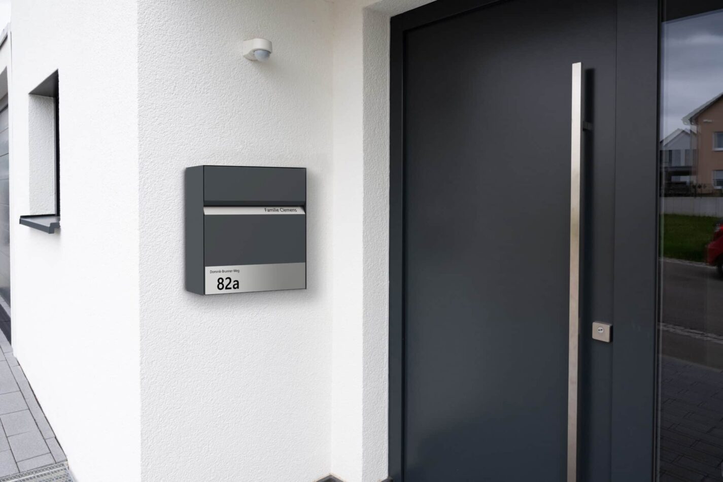 Mit einem optionalen, großen Edelstahlschild, das individuell laserbeschriftet werden kann, bieten die Kästen Platz für alle wichtigen Informationen – von der Hausnummer bis hin zu den einzelnen Bewohnernamen. Ein extra breites Namensschild unter der Klappe sorgt für zusätzlichen Raum und eine besonders klare, moderne Optik.