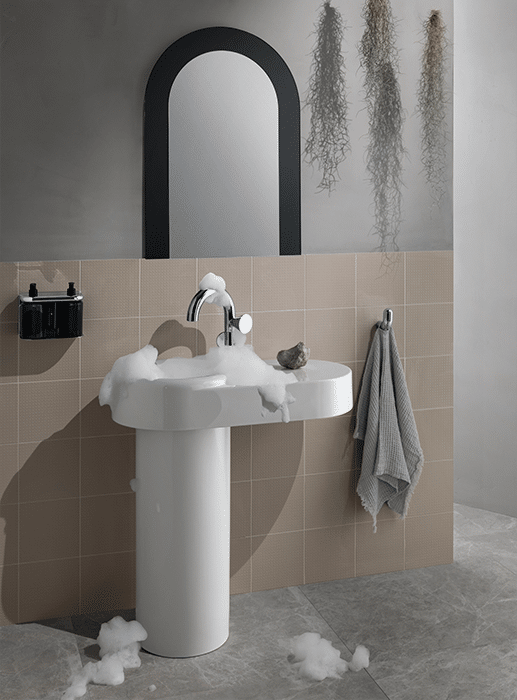 Bei Liquid ließ sich Dixon vor allem von viktorianischen Bädern inspirieren: „Mit ihren massiven Armaturen vermitteln sie ein Gefühl der Beständigkeit, das mag ich sehr. Ihre Ästhetik ist eng mit britischer Ingenieurs- und Handwerkskunst verbunden, die die Entwicklung moderner Bäder stark beeinflusst hat.“ Die Tatsache, dass der Werkstoff Porzellanton leicht verfügbar und extrem haltbar ist, hat den Designer besonders unter dem Aspekt der Nachhaltigkeit überzeugt. Ebenso begeisterte ihn das Material in seiner Wandelbarkeit: „Es ist faszinierend, wie sich ein Stück graue, schmierige Erde in etwas so Weißes, Sauberes und Glänzendes verwandeln kann.“