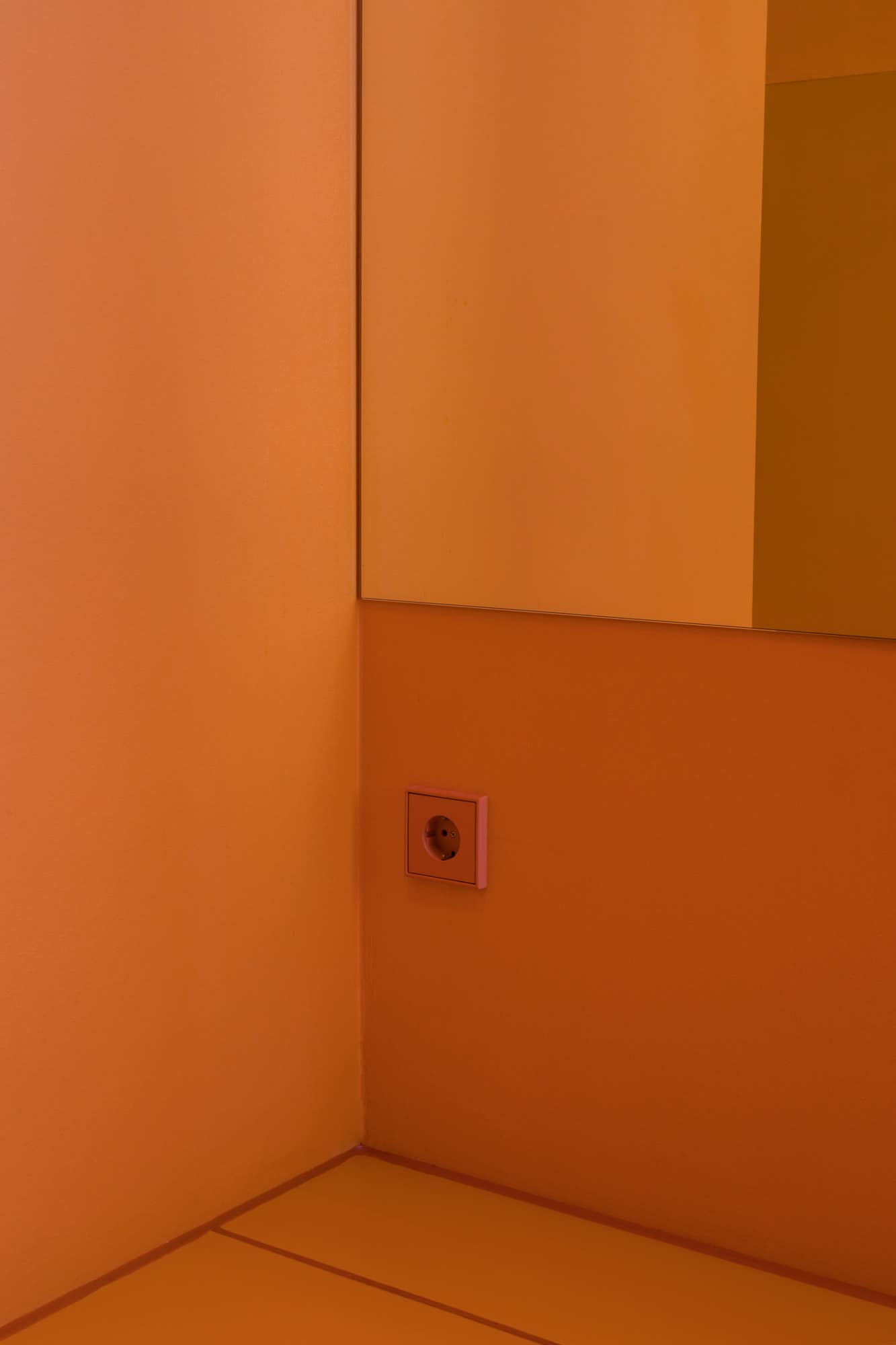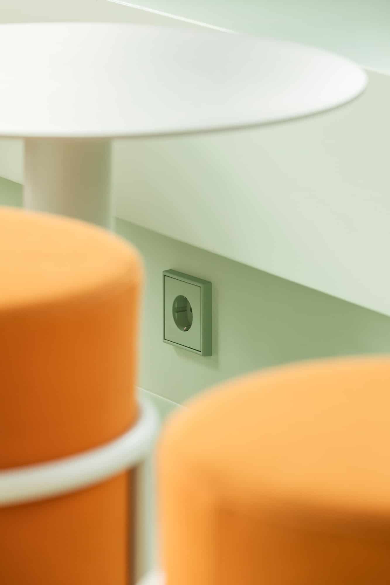 Im Mainzer Zollhafen-Areal befindet sich im Wohn- und Geschäftshaus Pandion Doxx das Bistro Goldmarie. Das Gestaltungskonzept von LNID und hdg Architekten basiert auf einem Farbkonzept aus verschiedenen Grüntönen, ergänzt durch ein kräftiges Orange. Die Farbe zieht sich über Wände, Decken, Böden, Möbel und Armaturen – bis hin zu den Schaltern und Steckdosen LS 990 in den Les Couleurs® Le Corbusier® Farbtönen orange vif und vert anglais pâle. Hier zeigt sich ein Vorteil des Les Couleurs® Netzwerks: Produkte verschiedener Hersteller können farblich exakt aufeinander abgestimmt werden, etwa Türdrücker von FSB und Elektroprodukte von JUNG.