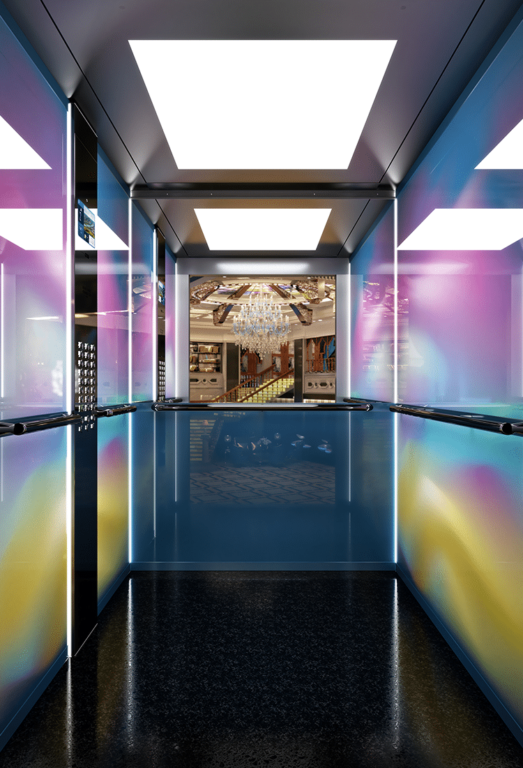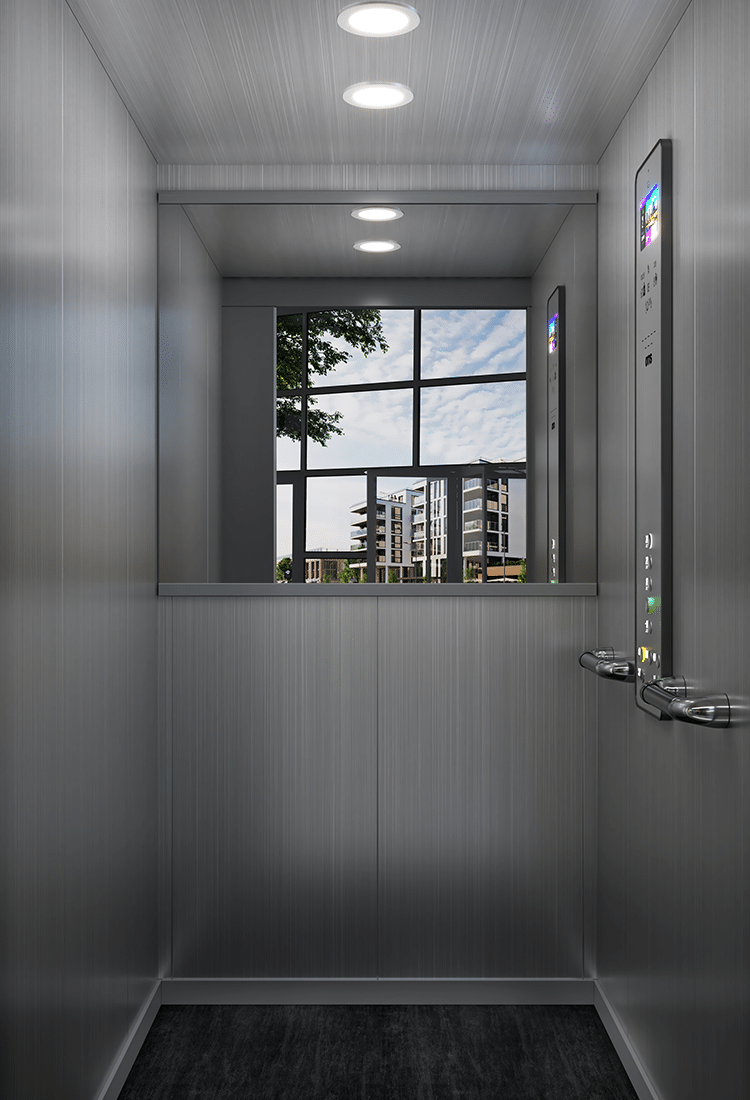 Mit über 400.000 Design-Optionen der Ambiance-Linie lassen sich Kabinen, Materialien, Farben und Beleuchtung individuell an das architektonische Gesamtkonzept anpassen. Das eView™-Display kann dezent integriert und mit gebäudespezifischen Inhalten bespielt werden.