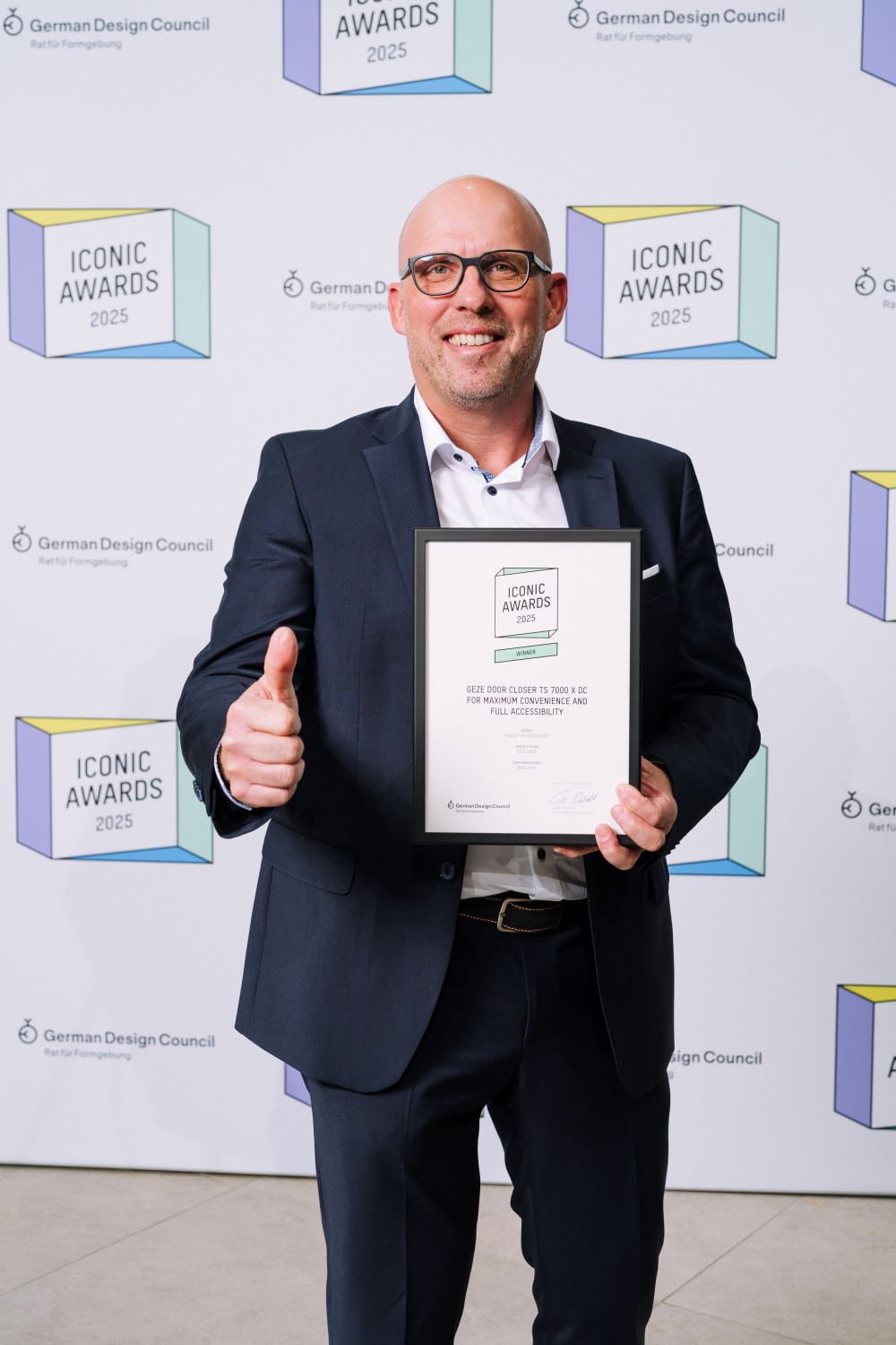 „Die Auszeichnung unserer neuen Türschließergeneration mit dem ICONIC AWARD 2025 ist eine großartige Bestätigung für unser Ziel, Funktionalität, Komfort und Design in Einklang zu bringen“, sagt Patric Schlecht, Director Development bei GEZE, der den Preis am 7. Oktober entgegennahm. „Jetzt freuen wir uns umso mehr darauf, wenn unsere Kunden den TS 7000 bald selbst im Einsatz erleben können.“