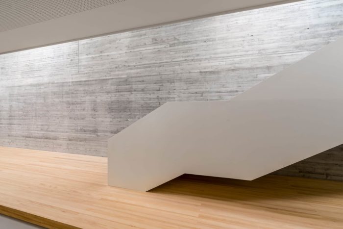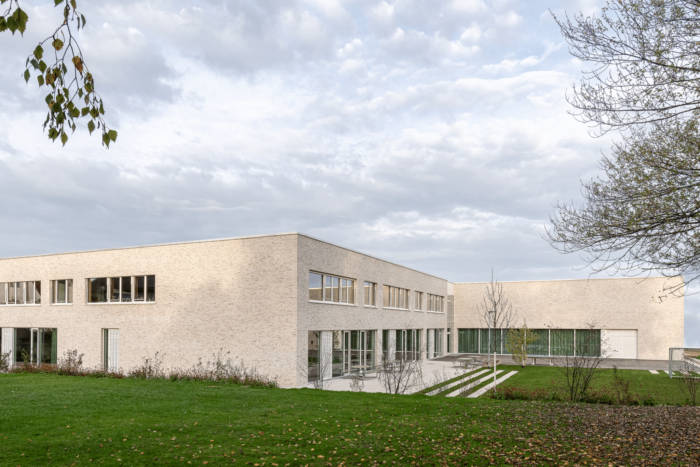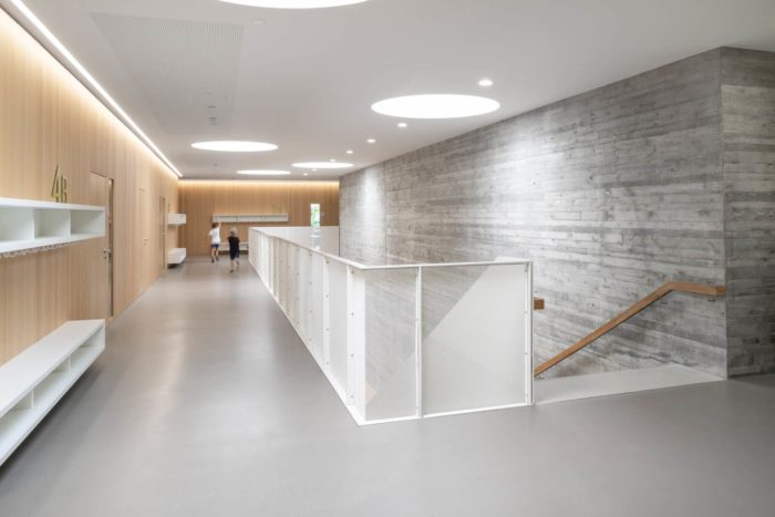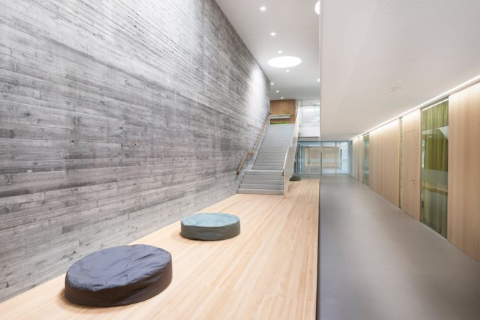 Die neue Grundschule ist öffentlich und einladend konzipiert. Sie zeichnet sich im Inneren durch ein harmonisches Zusammenspiel von Sichtbeton und Weißtanne Oberflächen aus. Die Einrichtung richtet sich nach den Bedürfnissen der Kinder.