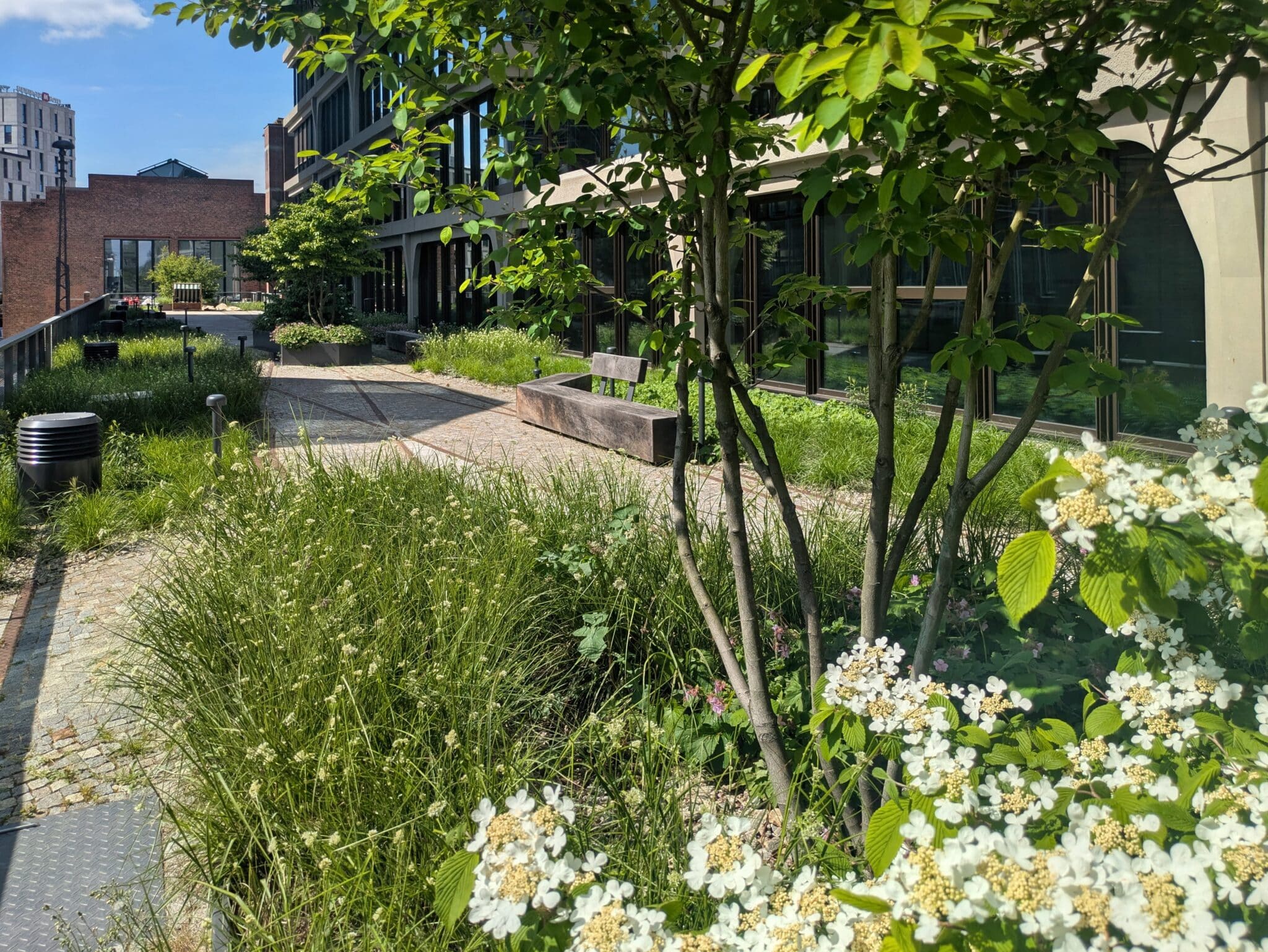 Von den 3000 Quadratmeter Dachfläche wurden rund 2700 Quadratmeter als Retentionsdächer ausgeführt. Diese dienen nicht nur der Speicherung und Nutzung von Regenwasser, sondern schaffen auch grüne Aufenthaltsbereiche mit hoher Aufenthaltsqualität. Besonders hervorzuheben ist die Gestaltung der Mieterterrasse auf dem historischen Eisenbahnviadukt. Intensive Begrünung, Sitzbereiche und naturnahe Vegetation verbinden hier die industrielle Vergangenheit des Standorts mit einer grünen, lebenswerten Zukunft. Insgesamt erfüllt das Projekt die Vorgabe des Umweltamtes, mindestens 50 Prozent der Dachfläche zu begrünen − und geht in seiner Umsetzung deutlich darüber hinaus. Das Regenwassermanagement wurde dabei technisch präzise auf die örtlichen Gegebenheiten abgestimmt. Um den anfallenden Niederschlag gezielt zurückzuhalten, verdunsten zu lassen und bei Bedarf kontrolliert abzuleiten, wurden die oberen Dachflächen mit statischen Ablaufdrosseln ausgestattet. Über Kapillarbrücken gelangt das gespeicherte Regenwasser in das darüberliegende Vlies, wo es gleichmäßig verteilt und anschließend vom Substrat aufgenommen wird. Auf diese Weise steht es der Vegetation kontinuierlich zur Verfügung. Das überschüssige Wasser fließt kaskadenartig von den einzelnen Dachflächen in den rund 30 Zentimeter starken Retentionsspeicher über dem historischen Eisenbahnviadukt. Dort sorgt die intelligent gesteuerte Drossel Smart Flow Control dafür, dass das System auf Wetterveränderungen reagieren kann. Sie erkennt bevorstehende Starkregenereignisse und reguliert den Abfluss des gespeicherten Wassers entsprechend der aktuellen Wetterprognosen und des Wasserstands in den Optigrün Retentionsboxen.