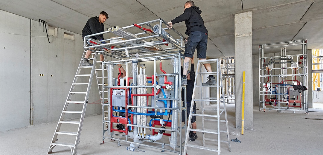 Durch den Einsatz einer gemeinsamen Installationswand als Trennwand zwischen zwei Bädern oder zwischen Bad und Küche entfällt die konventionelle Massiv- oder Leichtbauwand. Dadurch lassen sich Bauraum, Bauzeit und Ausbaukosten spürbar reduzieren und gleichzeitig Schall- und Brandschutzanforderungen sicher umsetzen.