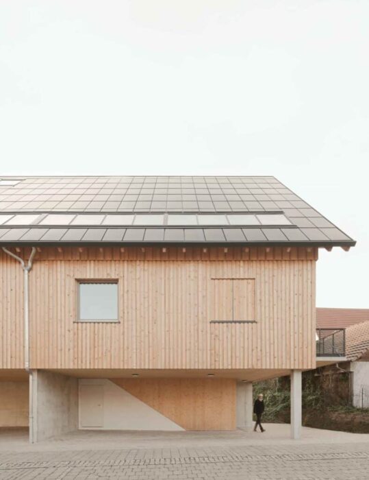 Im Ortskern des idyllischen Pfannendorf steht seit diesem Jahr ein Gebäude, das sich nahtlos in die umliegende Natur und Architektur einfügt und aufgrund einiger Merkmale dennoch auf seine ganz eigene Weise heraussticht. Als „Holzmonolith“ beschrieben, nimmt das aufgeständerte Privathaus sowohl die Maserung als auch die Dachform seiner Umgebung subtil auf und erzeugt mit seiner gestaffelten Struktur aus Steinsockel und auskragendem Holzbau eine optische Verbindung mit den umliegenden Fachwerkhäusern. Um keine Kompromisse in punkto Design eingehen zu müssen, hat man sich beim Thema Photovoltaik für eine Ganzdachlösung des Magdeburger Unternehmens Ennogie entschieden.