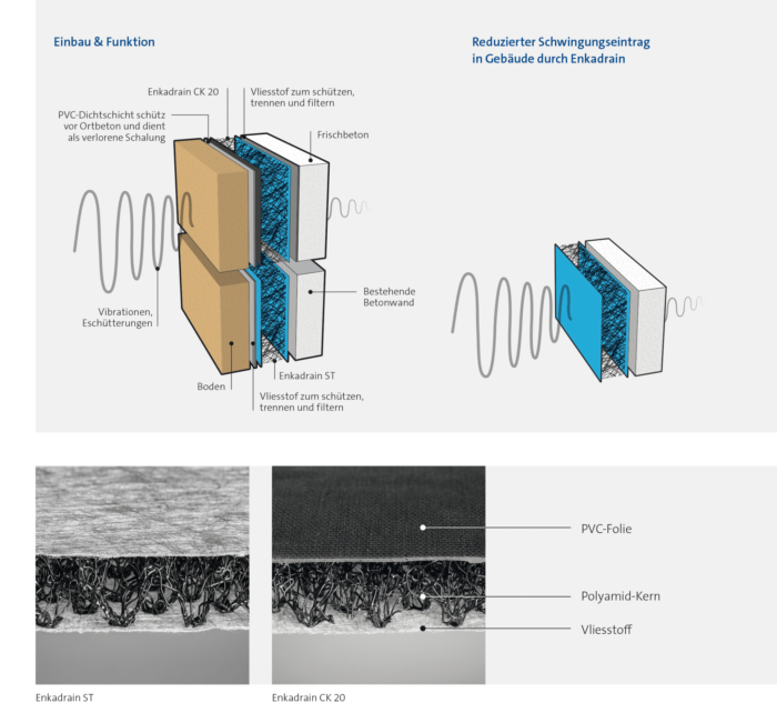 In umfangreicher Forschungsarbeit und nach In-Situ-Überwachung haben sich die Produktvarianten EnkaDrain ST und EnkaDrain CK als optimale Lösung für die Körperschallentkopplung erwiesen. Die multifunktionalen Geoverbundstoffe bestehen aus einem dreidimensionalen Kern aus synthetischen Monofilamenten, der beidseitig mit einem Filtervliesstoff (EnkaDrain ST) bzw. einem Filtervliesstoff und betonierdichtem PVC (EnkaDrain CK) versehen ist. Beide Geoverbundstoffe sind druckstabil und flexibel zugleich. Zudem zeichnen sie sich durch ein geringes Eigengewicht aus. Weil ihr Kern aus Polyamid gefertigt ist, behalten die Geoverbundstoffe ihre dauerelastischen Eigenschaften auch bei niedrigen Temperaturen bei.