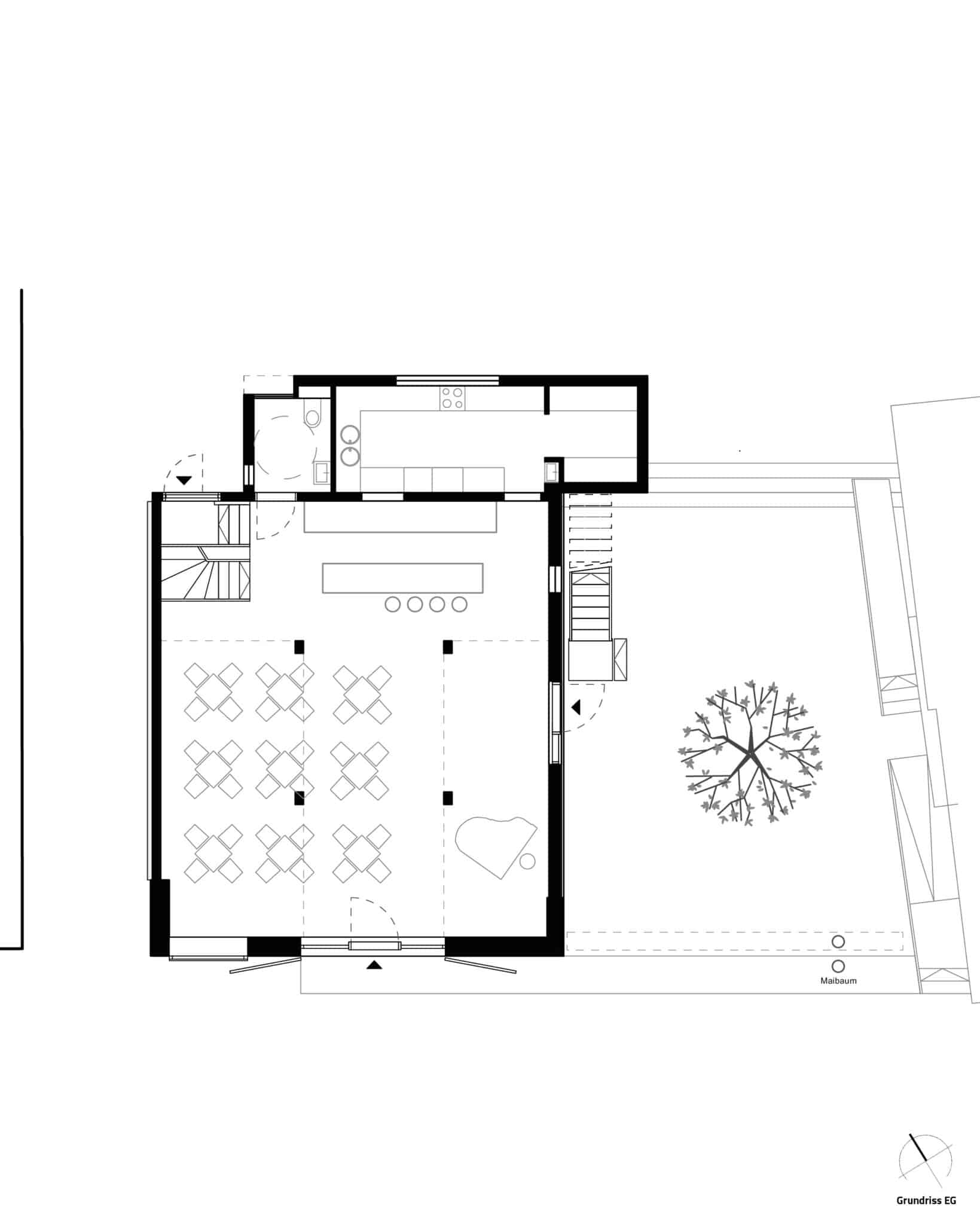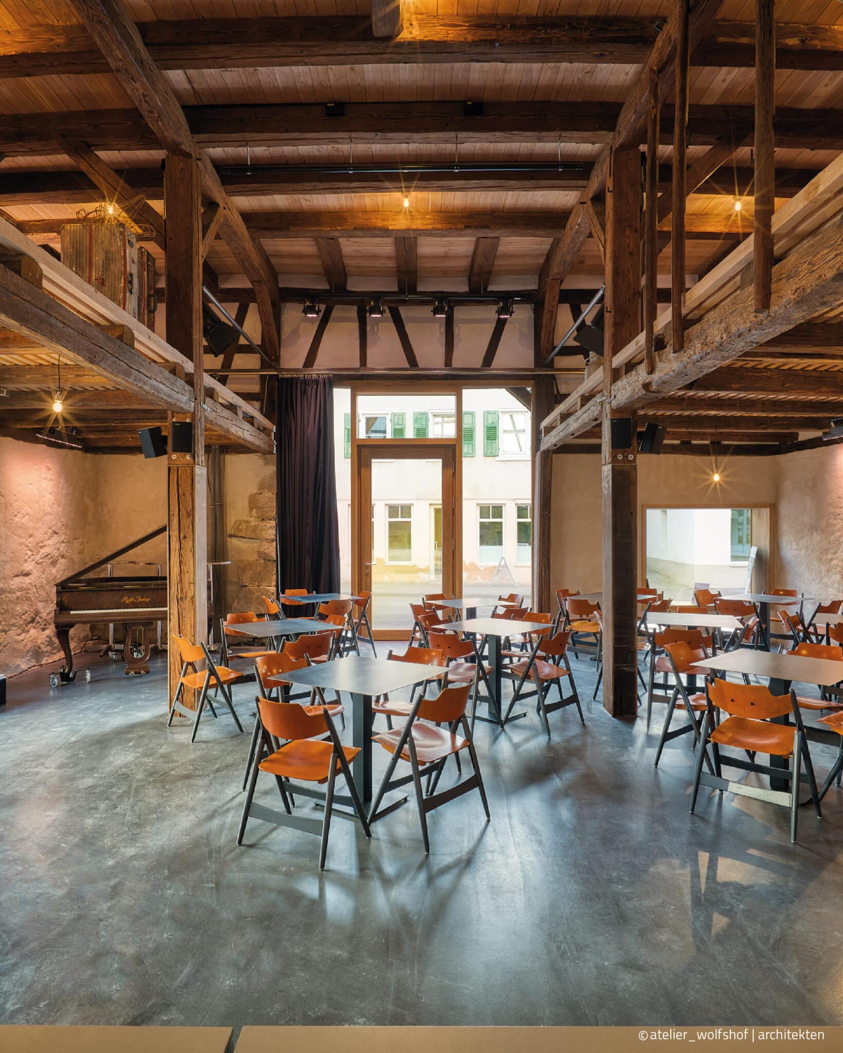 Räumlich mit „Luft-Balken“ gefasst, bildet der seitlich angelegte Hofraum das Pendant als Open-Air-Bühne im öffentlichen Raum.
