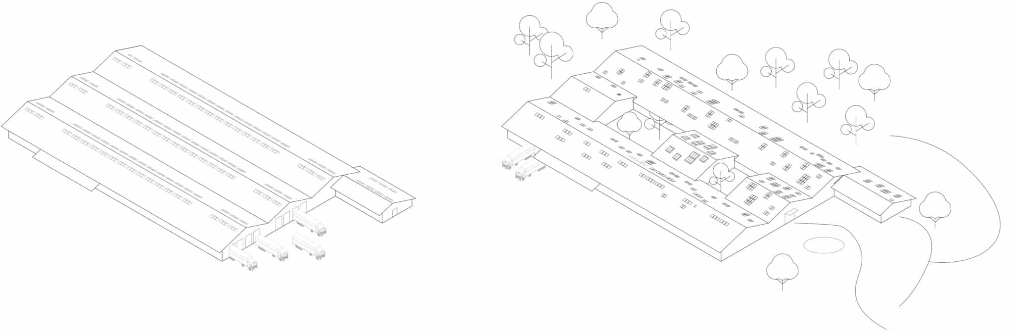 Der Eingriff transformiert die ehemaligen LKW-Rampen zur neuen Adresse mit dem Namen „Daylight Square“ und verbindet das Gebäude mit dem angrenzenden Landschaftspark. Die drei Hallenschiffe mit identischen Holzbögen bleiben als robuste Primärstruktur bestehen und die Dachelemente folgen dem konstruktiven Raster und erlauben ein präzises Setzen von Öffnungen.