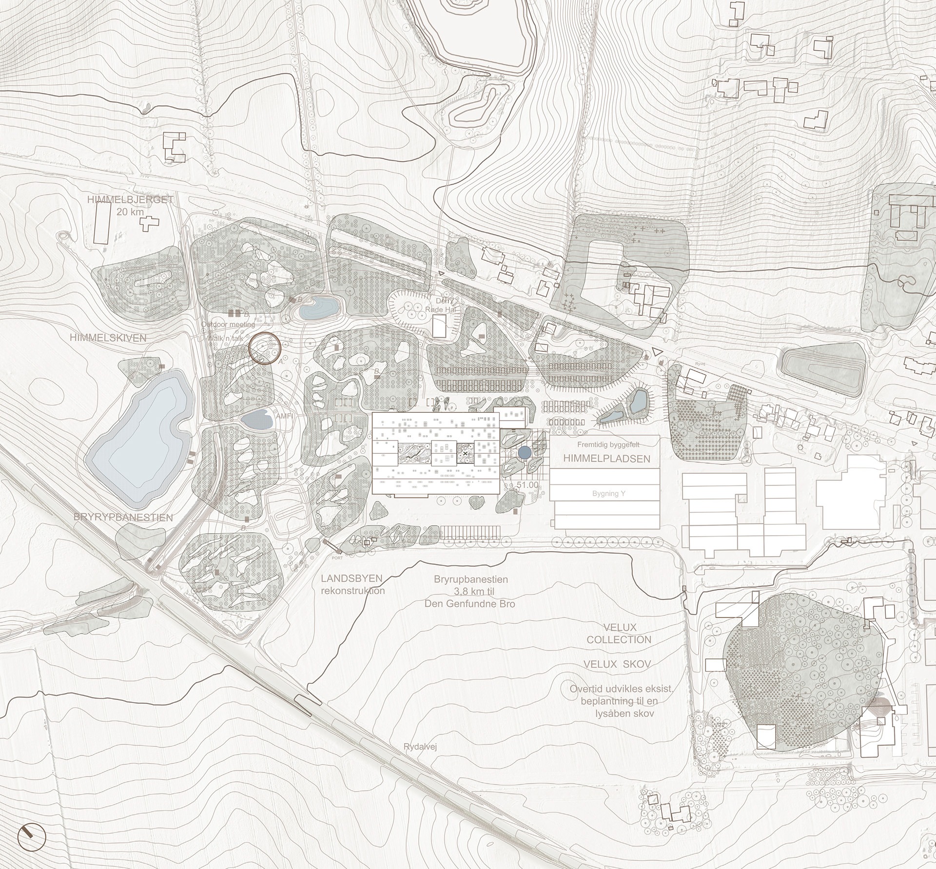 Außen werden versiegelte Flächen zurückgebaut, ein Teich angelegt und üppig begrünte Zonen mit Fahrradunterständen und Sitzplätzen geschaffen. Die wichtigste Maßnahme ist „Nature Østbirk“, ein 70.000 m² großer, öffentlich zugänglicher Landschaftspark mit Wegen, Vogel- und Naturbeobachtungstürmen sowie Picknickplätzen aus lokalem Holz, der als grünes Kontinuum das Campusareal mit dem Ort verbindet.