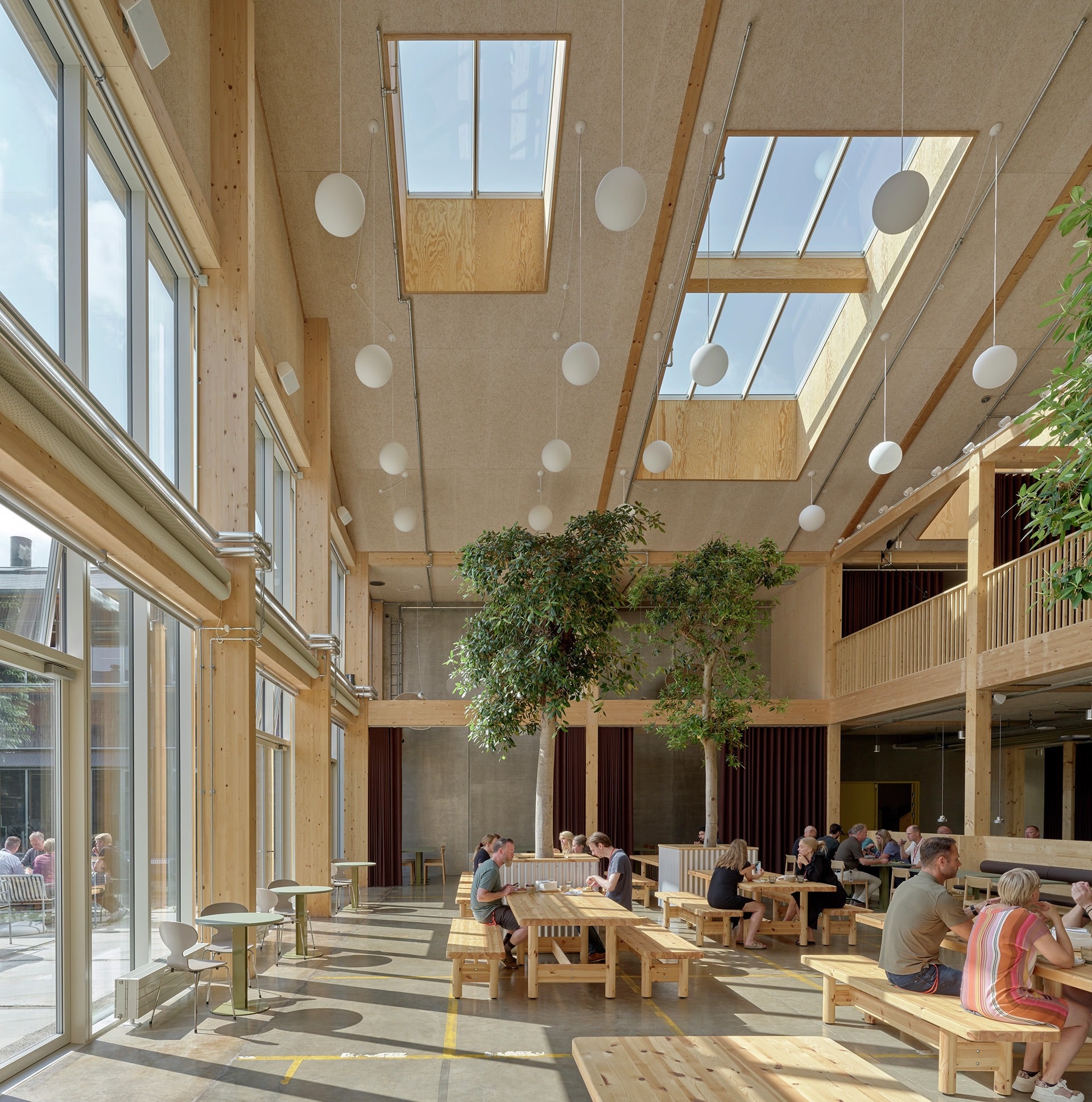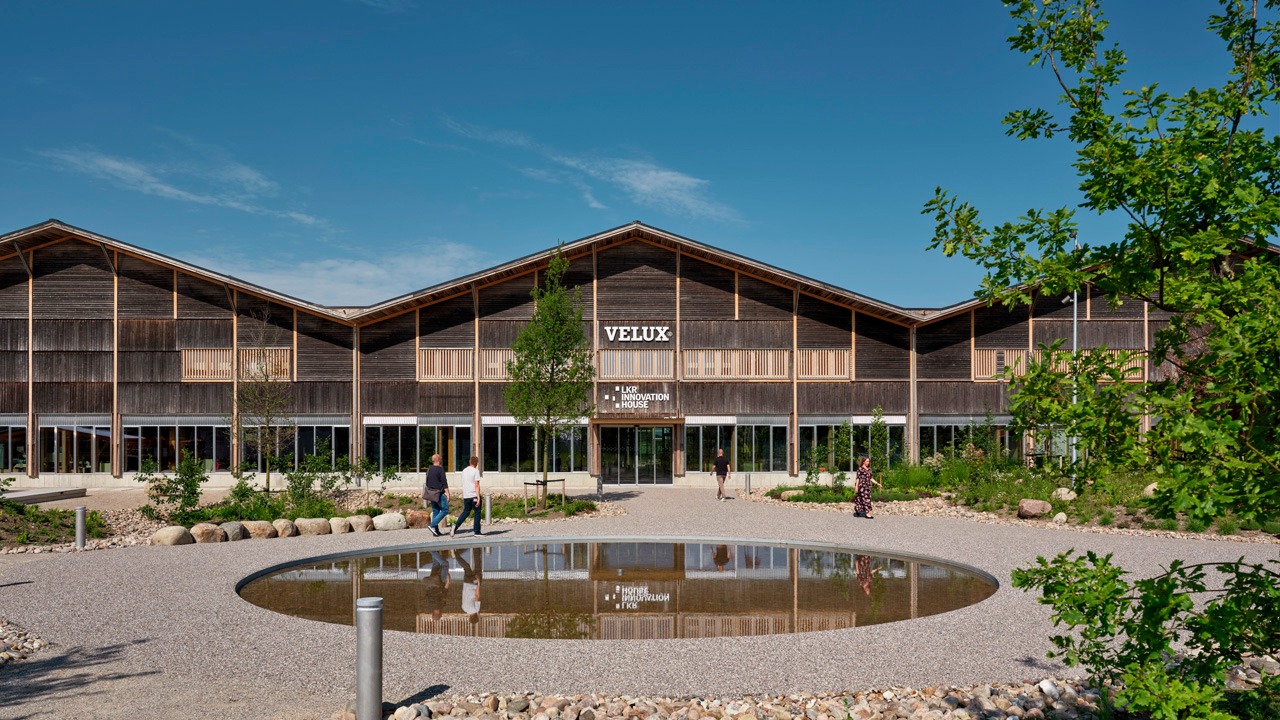 Der Umbau zum LKR Innovation House von PRAKSIS Arkitekter erhält die tragende Holzkonstruktion und den Betonboden weitgehend und ergänzt zwei Innenhöfe, Oberlichter und Fassadenöffnungen. Tageslicht, natürliche Belüftung und Sichtbezüge strukturieren den Grundriss und schaffen Arbeitslandschaften für rund 500 Mitarbeitende aus Design, Entwicklung und Umsetzung.