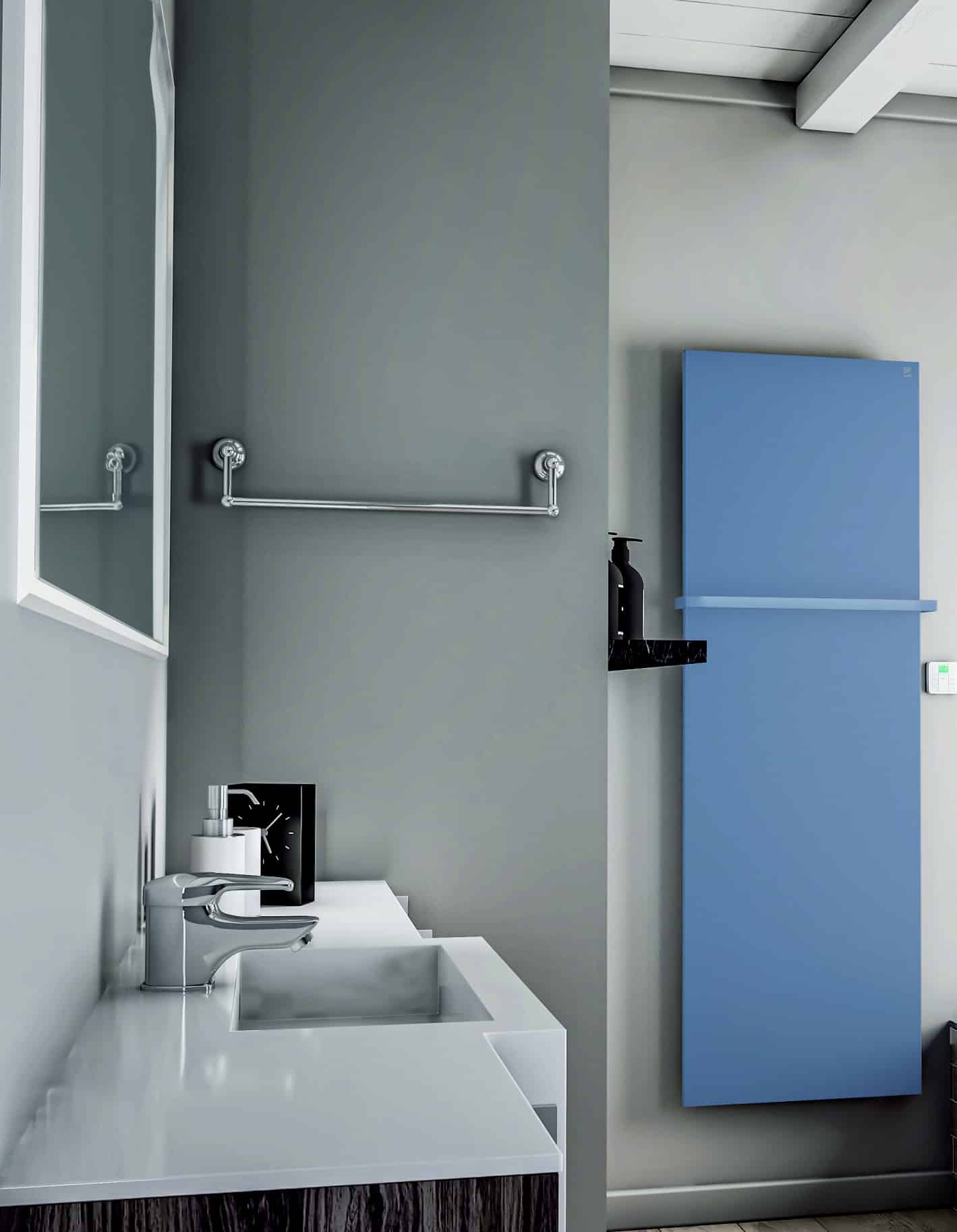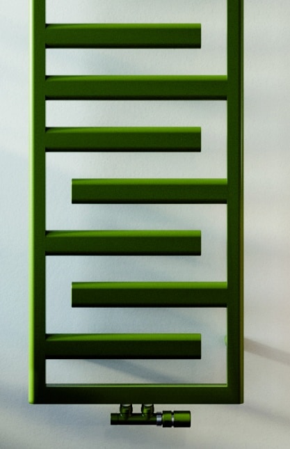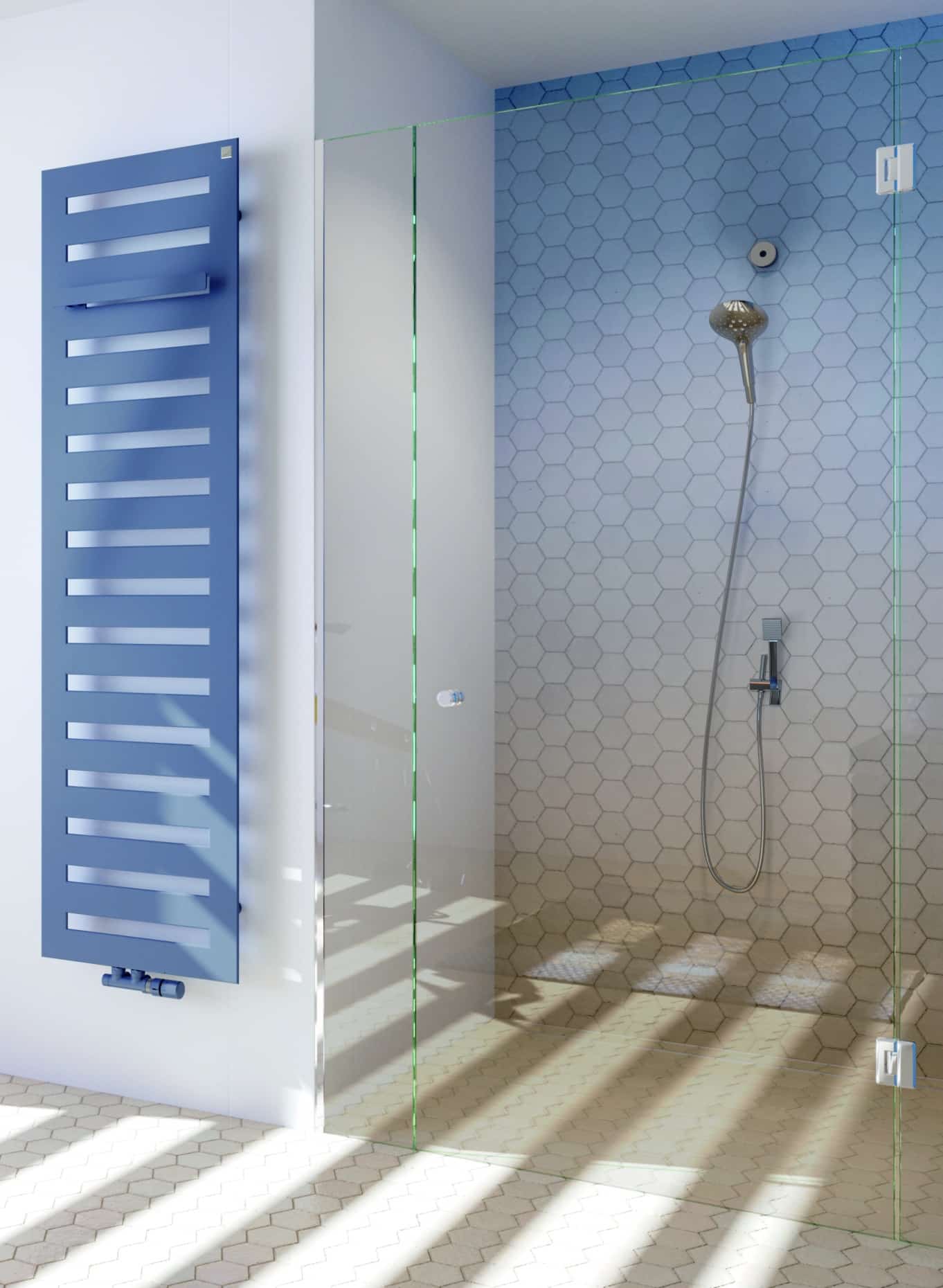 Farbige Zehnder Design-Heizkörper mit Zubehör in Heizkörperfarbe für moderne Badezimmer