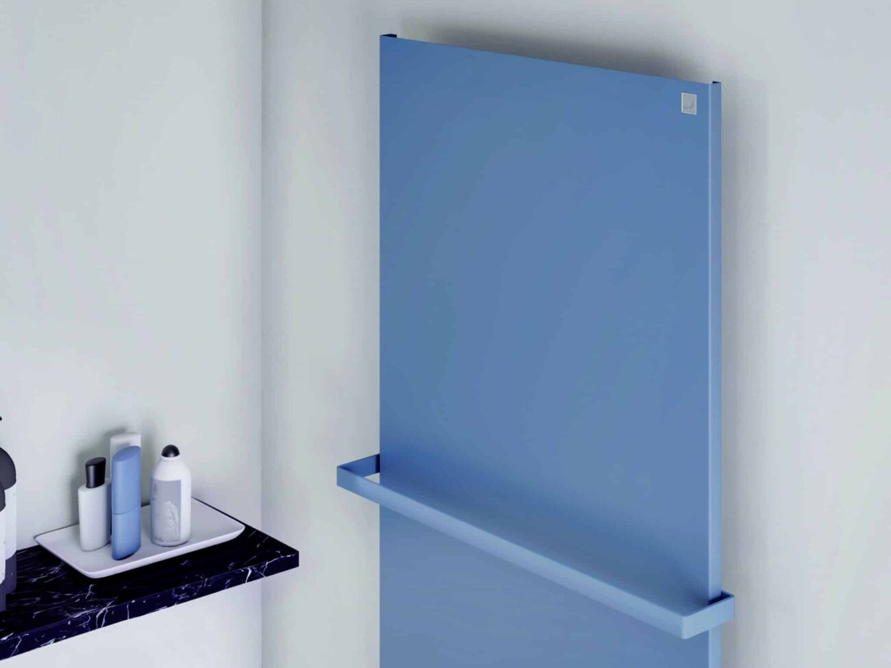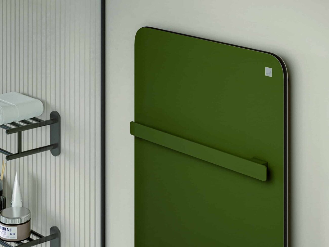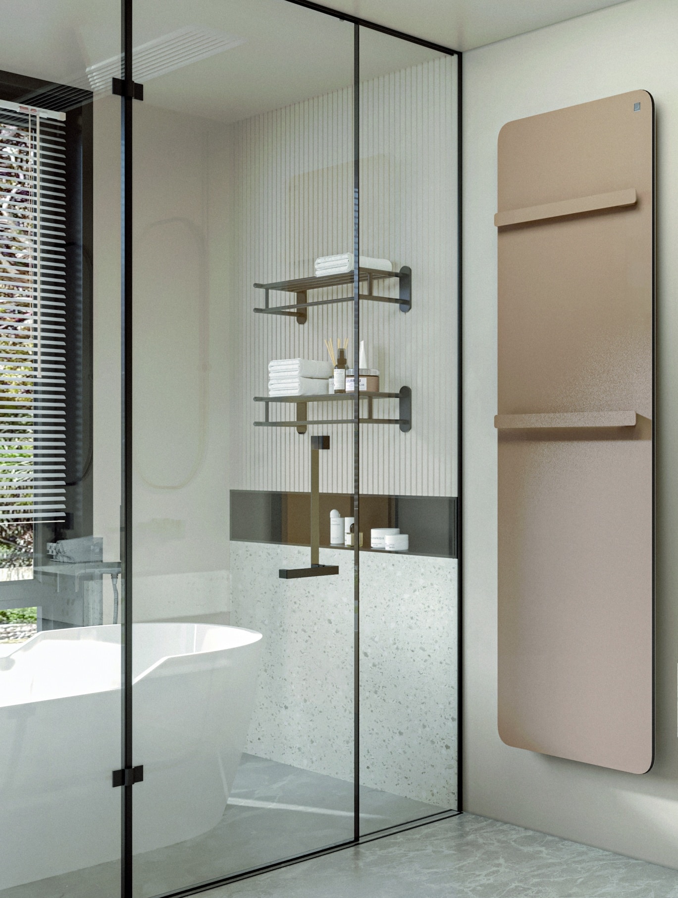Farbige Zehnder Design-Heizkörper mit Zubehör in Heizkörperfarbe für moderne Badezimmer