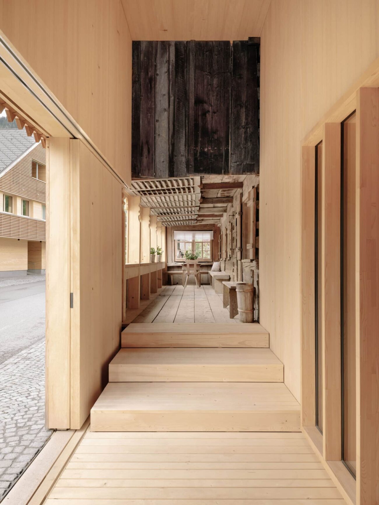 Das ursprüngliche Haus war eine reine Holzkonstruktion – ein Prinzip, das beibehalten wurde. Die historische Südfassade blieb weitgehend erhalten. Der Zutritt erfolgt jetzt über eine Schiebetür, die in einen unbeheizten Windfang führt – dahinter liegt eine Glastür zum beheizten Innenraum. Diese traditionelle Lösung ist typisch für alte Bregenzerwälder Bauernhäuser und kommt in klimabewussten Projekten immer wieder zum Einsatz.