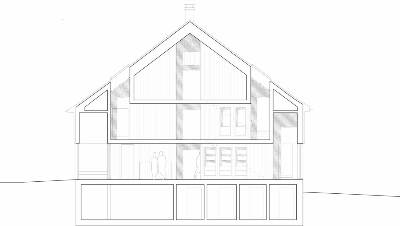 Den baufälligen Anbau ersetzten die Architekt:innen durch einen Erweiterungsbau, basierend auf einem konstruktiven Holzbau, das Untergeschoss als vollständiger Massivbau. Der Neubau erhielt eine Holzverkleidung aus regionaler Fichte und Tanne und zeigt an der Nordfassade dekorative Versprünge. Auf eine durchgehende horizontale Gliederung zwischen den Geschossen verzichteten die Architekt:innen jedoch. Die neue Eindeckung des Daches mit schwarzen Eternitplatten wurde über alle Gebäudeteile hinweggezogen, um eine einheitliche Wirkung zu erzielen und Alt- und Neubau zu einem stimmigen Ganzen verschmelzen zu lassen.