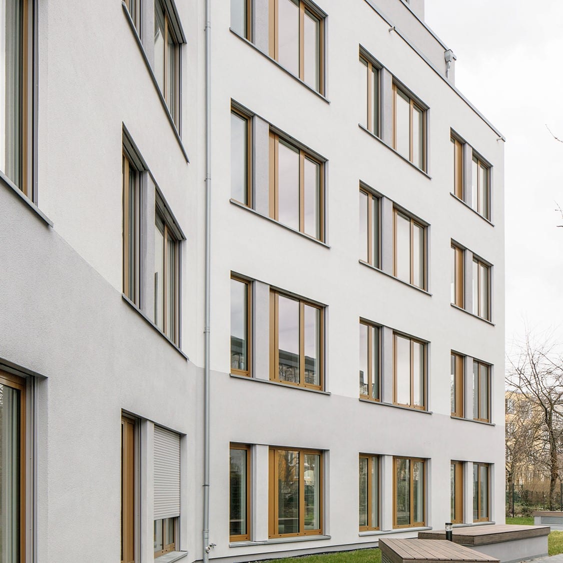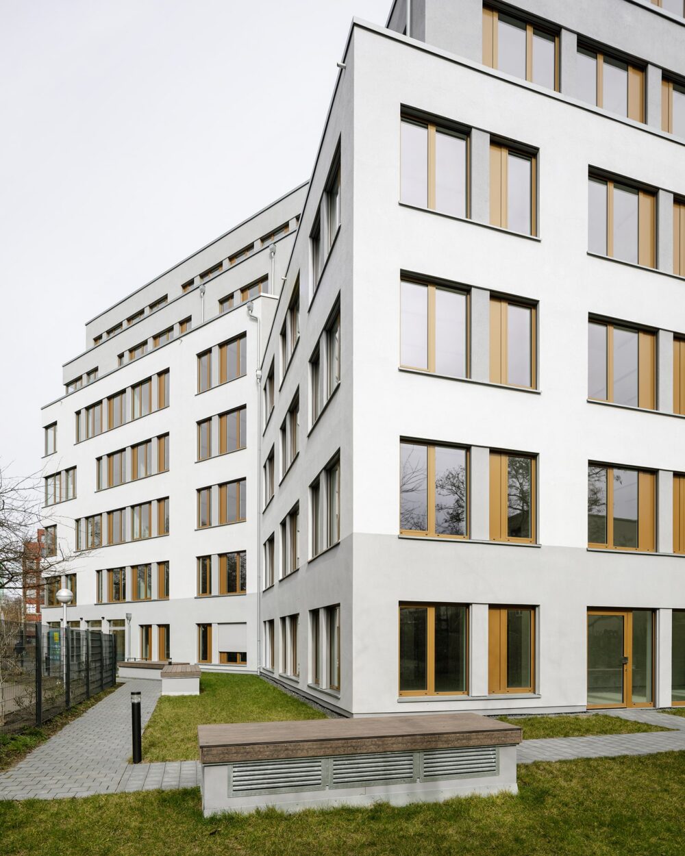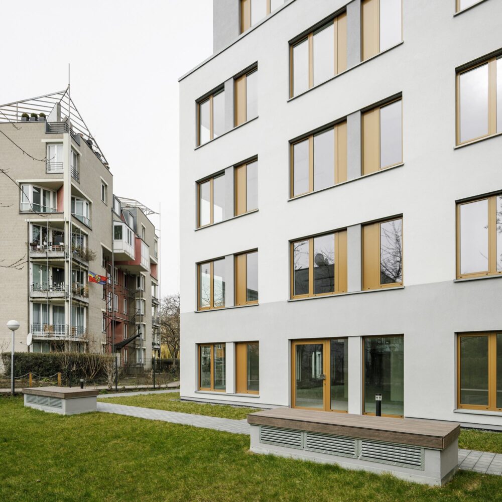Die Bebauung umfasst ein fünfgeschossiges Vorderhaus mit integriertem Hofgebäude sowie zweigeschossige, freistehende Mehrfamilien- und Gartenhäuser. Insgesamt entstehen 93 Wohneinheiten in Massivbauweise mit Klinker- und Putzfassaden, deren Dächer begrünt gestaltet werden. Angeboten werden hochwertige 2- bis 4-Zimmer-Wohnungen, teilweise als Maisonette, jeweils mit großzügigen Balkonen und Terrassen. Gemeinschaftliche Rasenflächen mit Bäumen sowie Spielplätze runden das Wohnangebot ab.
