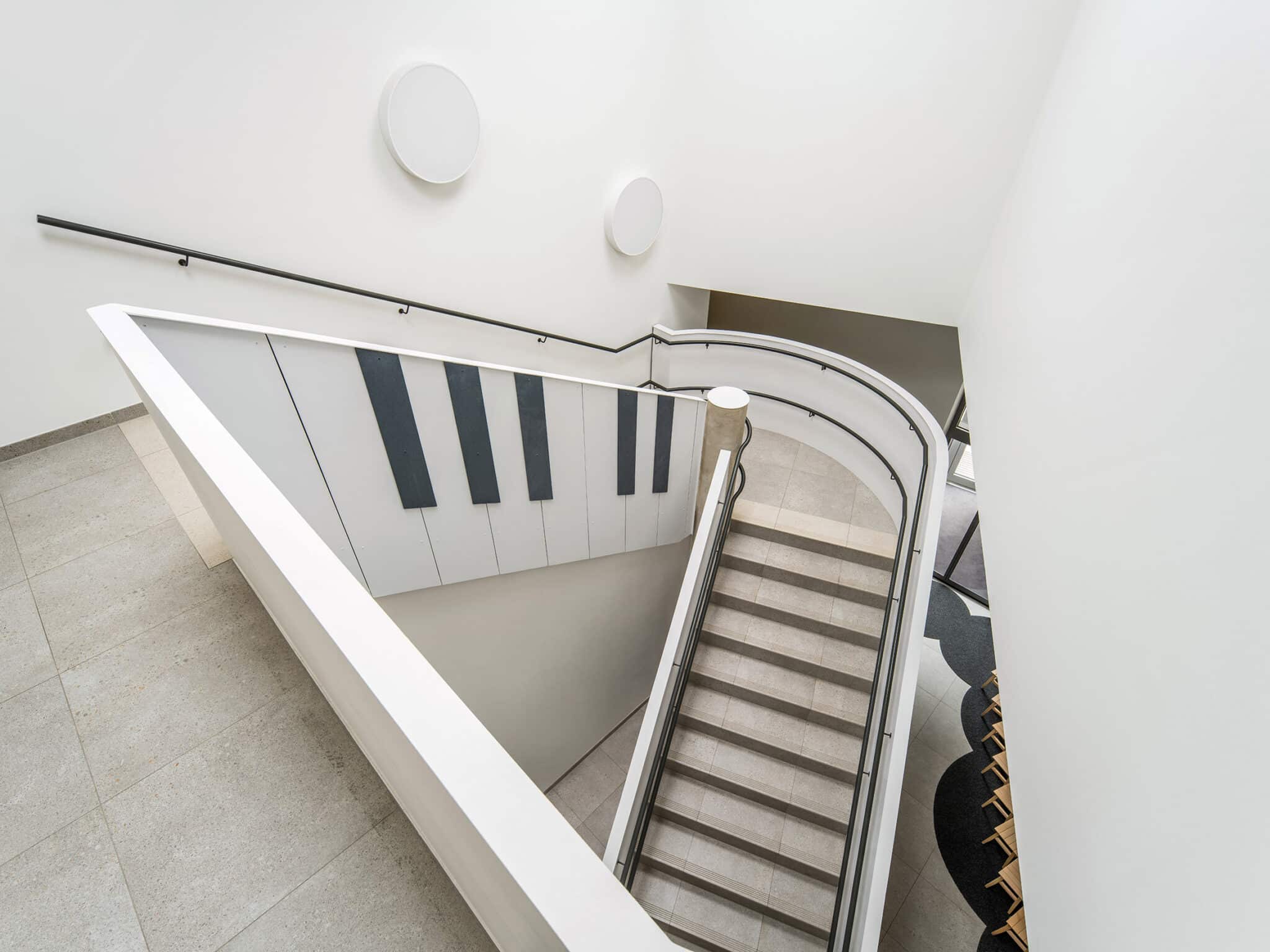 Dem raffiniert gestalteten Innenraum mangelt es weder an Luftigkeit noch an ausreichend Licht. Er kombiniert Gestaltung und Funktionalität und ergänzt sie durch verspielte Elemente. Unter anderem konzipierte der Architekt das Geländer der zentralen Treppe als stilisierte Klaviatur. Die Gestaltung der einzelnen Räume beeindruckt ebenfalls, spiegelt sie doch den nordischen Stil wider und nutzt die Mannigfaltigkeit von Naturmaterialien.