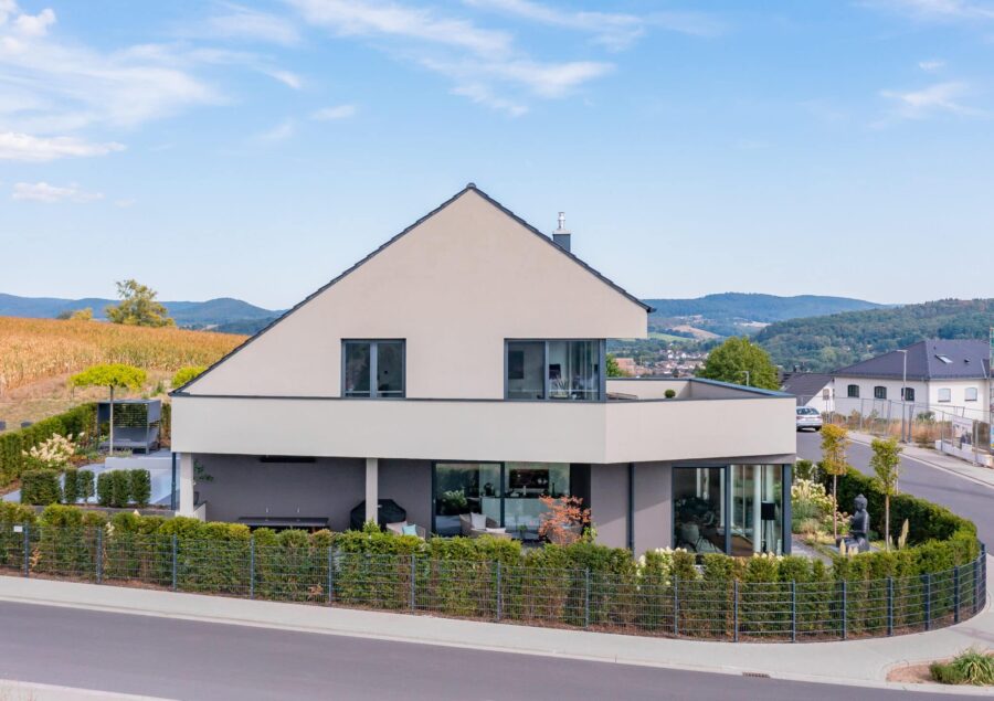 Herzensprojekt Wohnhaus Herzensprojekte bedeuten für uns Projekte, bei denen auch der Bauherr mit vollem Herzen dabei ist und sich seinen Lebenstraum von einem neuen Zuhause erfüllen kann. In diesem Fall haben die Bauherren jahrelang vom Flachdach geträumt. Bauplanungsrechtlich konnten wir Ihnen diesen Traum nicht erfüllen. Allerdings haben wir es mit dem rückversetzten Satteldach und dem