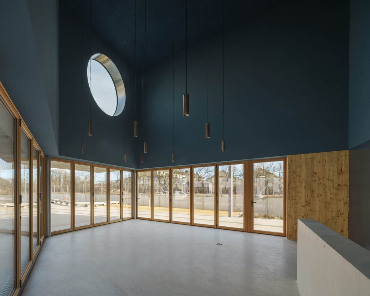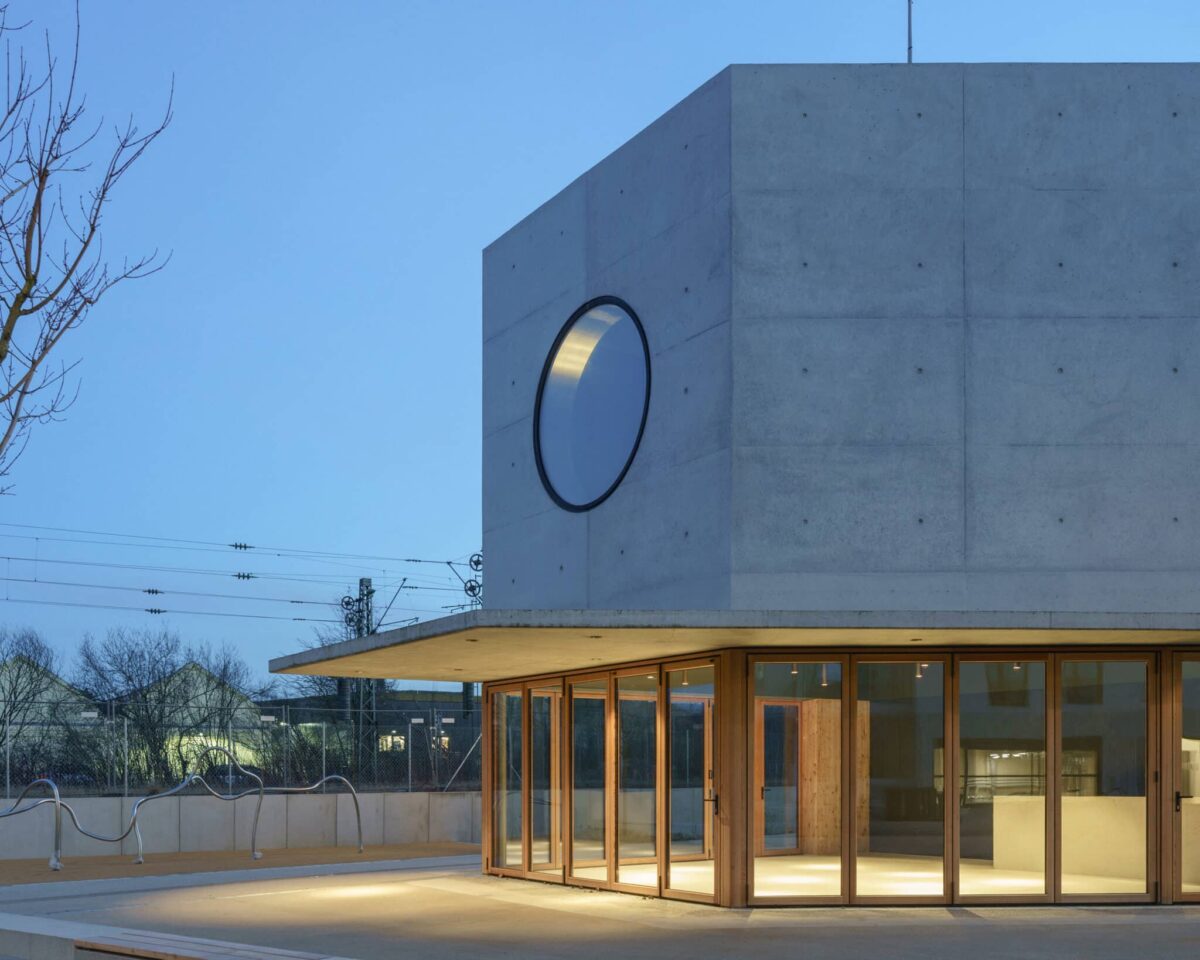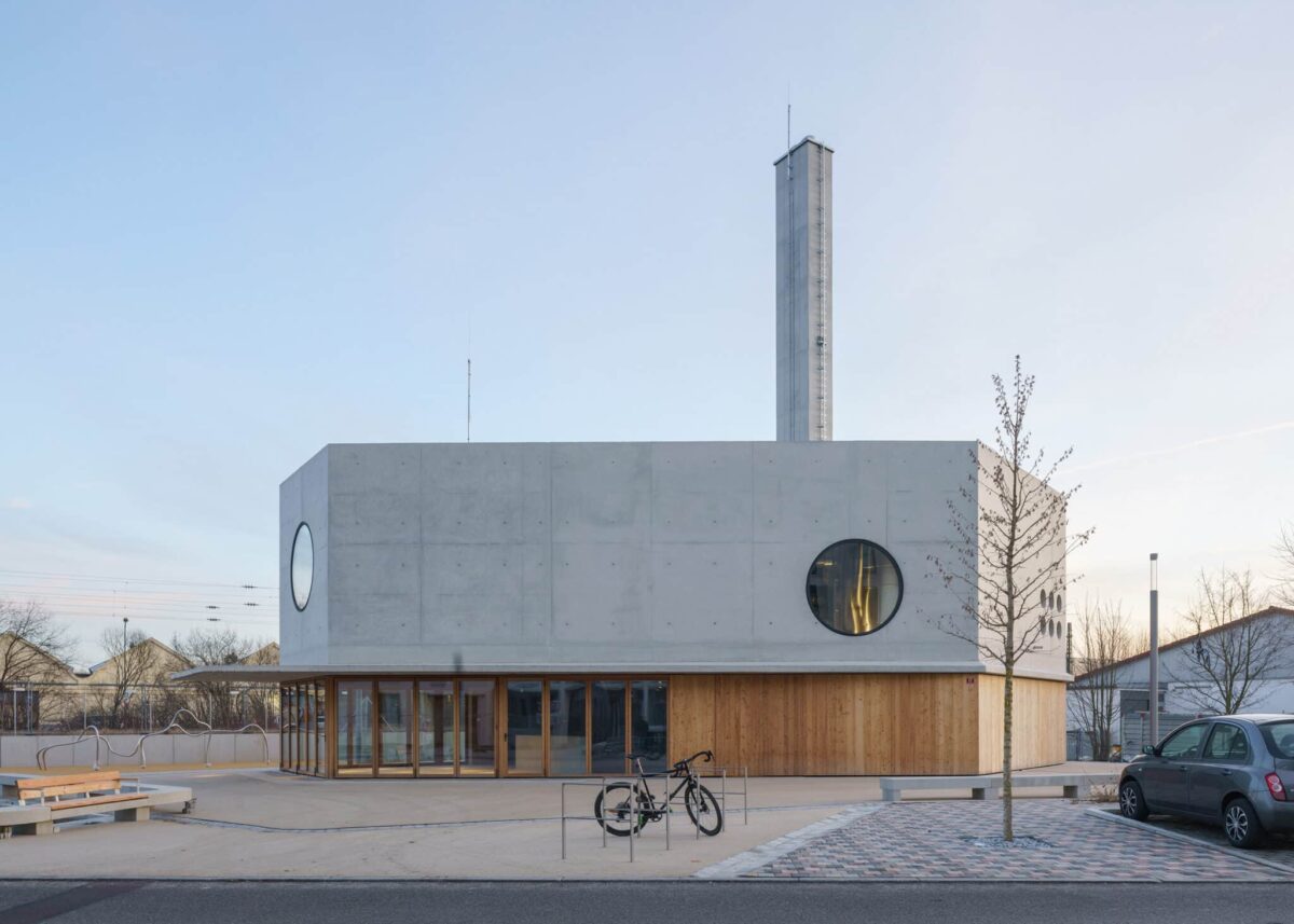 Die verschiedenen, schon fast gegensätzlichen Nutzungen in Einklang zu bringen, erwies sich als große Herausforderung. Gleichzeitig ergab sich aus der hybriden Nutzung die plastische Figur der neuen Energiezentrale. Der große Generator, der den Strom erzeugt, benötigt aus statischen und schallschutztechnischen Gründen Masse – was den Einsatz von Beton als Material vorgab. Der 24 Meter hohe Abluftkamin wurde ebenfalls betoniert und so in die Skulptur integriert. Die Höhe des Bauwerks ist durch den 80.000 Liter fassenden Pufferspeicher definiert. Riesige Bullaugenfenster ziehen schon von Weitem neugierige Blicke auf sich und erlauben die Sicht ins Kraftwerksinnere. Mit einem mit Lärchenholz gefassten Erdgeschoss-Sockel nehmen die Architekt*innen dem schweren Volumen die Wucht. Die massive Sichtbetonfassade endet oberhalb der Holzverkleidung in einem Gesims. Dieses schützt die Holzverschalung und weitet sich im Bereich der Glas-Faltwände zu einem schlanken Vordach auf.