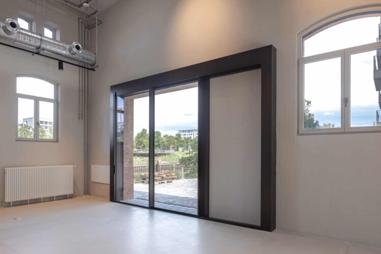 Durch die erhöhte Gebäudekubatur konnte die städtebauliche Präsenz des ehemaligen Kornversuchsspeichers im Quartier gestärkt werden. Als weiteren Mehrwert schaffen zwei große Dachterrassen mit gemauerten Brüstungen weite Ausblicke über den Kanal die Europacity. Und dass nicht nur im geschützten Außenraum, sondern auch von innen. Ermöglicht wird dies durch vier große Schiebefensteranlagen, zwei auf jeder Gebäudelängsseite, ein Wunsch des Bauherren. Die Wahl fiel auf das System cero III von Solarlux.