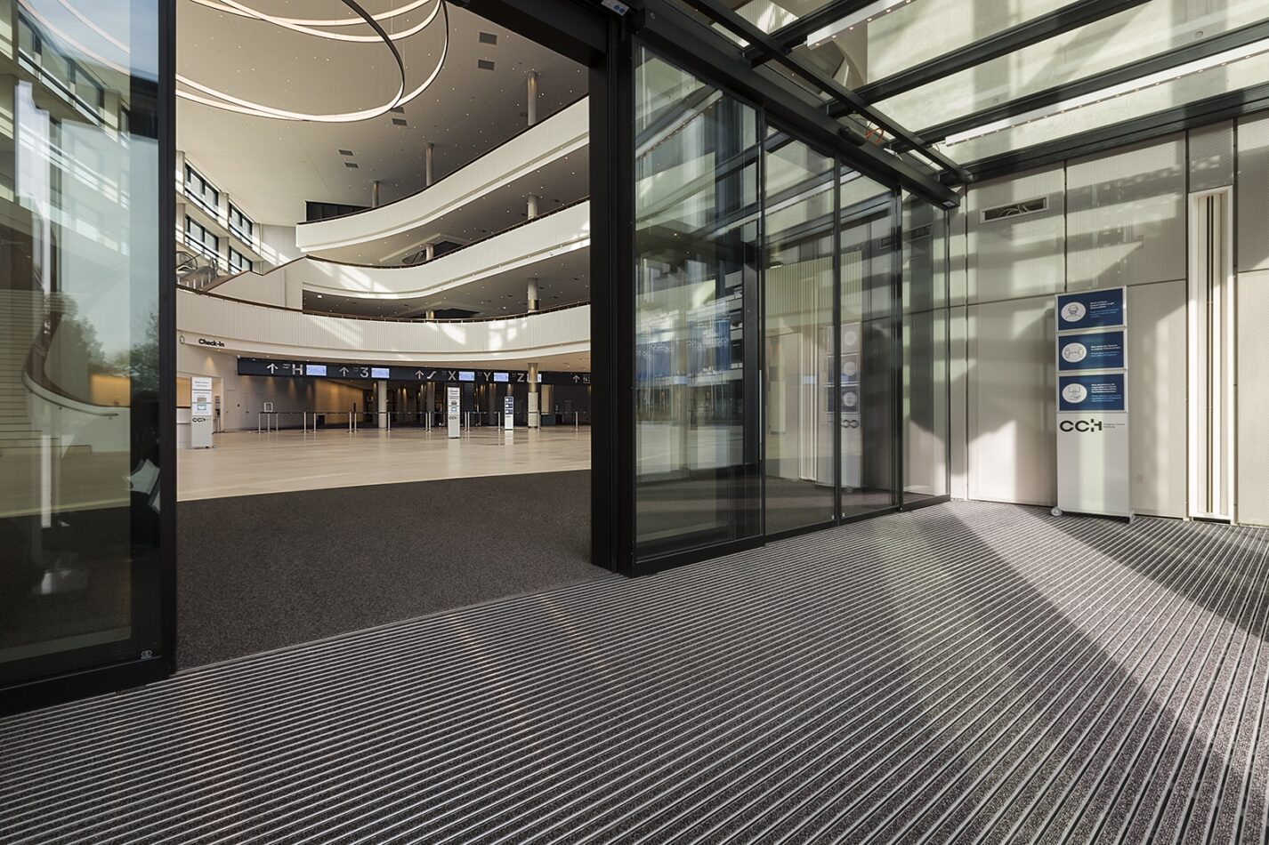 Die hohen Gästezahlen von bis zu 12.000 pro Tag sind unter anderem der Grund, warum bei der Planung des CCH die emco Bautechnik GmbH ins Spiel kam: Mit der 3-Zonen-Reinigung soll das helle, offene Gebäude vor Schmutzeintragungen zum Werterhalt bewahrt werden. Dafür sorgt die Eingangsmatte emco Marschall Premium mit den Performanceeinlagen OUTDOOR und CARE: Die abriebfeste emco OUTDOOR für den überdachten Außenbereich hat eine ideale kratzende Eigenschaft, die für die Aufnahme von Grobschmutz in Zone 1 sorgt. In Zone 2 – dem Windfang – enthält die Marschall Premium die äußerst widerstandsfähige und lichtechte Performanceeinlage CARE. Sie schützt hochwertige Bodenbeläge durch effektive Schmutzreduzierung. CARE ist auch gleichzeitig der Sauberlauf-Bodenbelag der Zone 3 und bietet zusammen mit der Zone 2 eine farblich-harmonische Optik. Die eingebauten Schmutzfangwannen aus Chrom-Nickel-Stahl (V2A) nehmen zusätzlich große Mengen Straßenschmutz auf, leiten Regen und Schnee optimal ab und verlängern so die Intervalle der Grundreinigung im Gebäude.